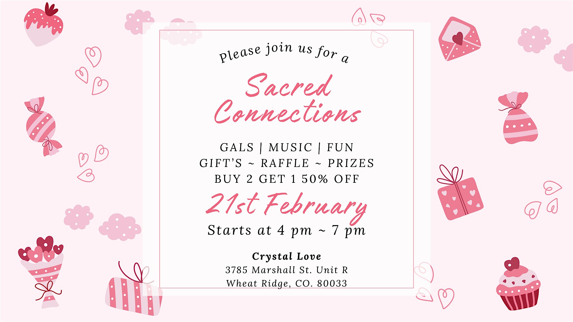 by admin13Feb ✨ Sacred Connections: A Crystal Love Social ✨ at Crystal Love – Metaphysical & Plant Store – Wheat Ridge, CO ✨ Sacred Connections: A Crystal Love Social ✨ at Crystal Love – Metaphysical & Plant Store – Wheat Ridge, CO 3 3 people viewed this event. Join us for The Crystal Love Social Party — a FREE, high-vibe celebration of self-love, sisterhood, & a little magic ✨ Tickets-RSVP Link Date And Time Saturday, February 21st, 2026 11:00 PM (PST) Venue Crystal Love - Metaphysical & Plant Store Location 3785 Marshall Street, Wheat Ridge, CO 80033 Event Types Party or Social GatheringSeasonal & Holiday Event Category Colorado Share With Friends Facebook Twitter Linkedin Xing Pinterest Share This Post: