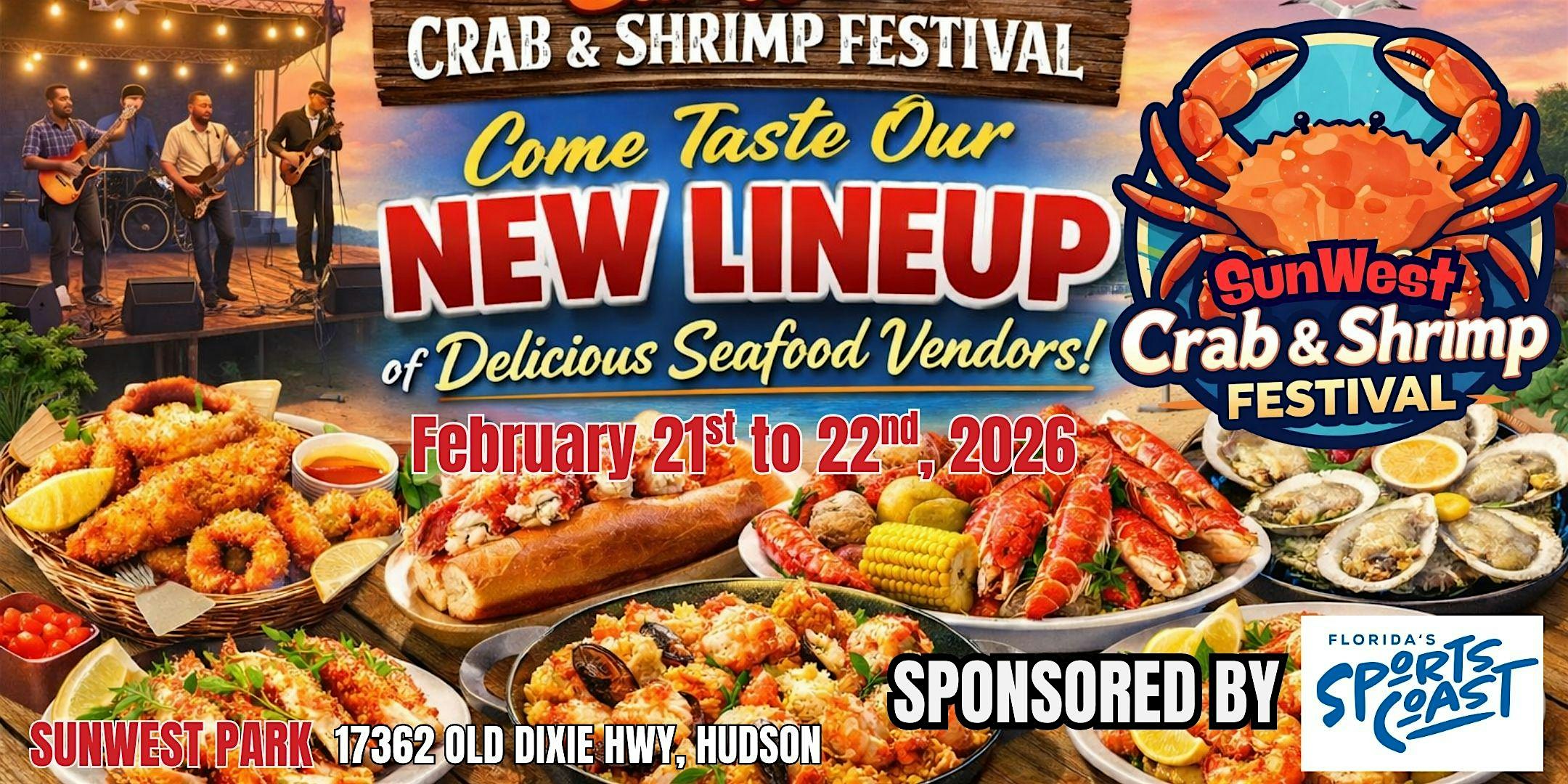 by admin12Feb 11th Anniversary SunWest Crab & Shrimp Festival at SunWest Park – Hudson, FL 11th Anniversary SunWest Crab & Shrimp Festival at SunWest Park – Hudson, FL 5 5 people viewed this event. Come celebrate Pasco with delicious seafood at the SunWest Crab & Shrimp Festival – it’s gonna be shrimply the best! Tickets-RSVP Link Date And Time Saturday, February 21st, 2026 04:00 PM (PST) Venue SunWest Park Location 17362 Old Dixie Highway, Hudson, FL 34667 Event Types Festival or FairFood & Drink Event Category Florida Share With Friends Facebook Twitter Linkedin Xing Pinterest Share This Post: