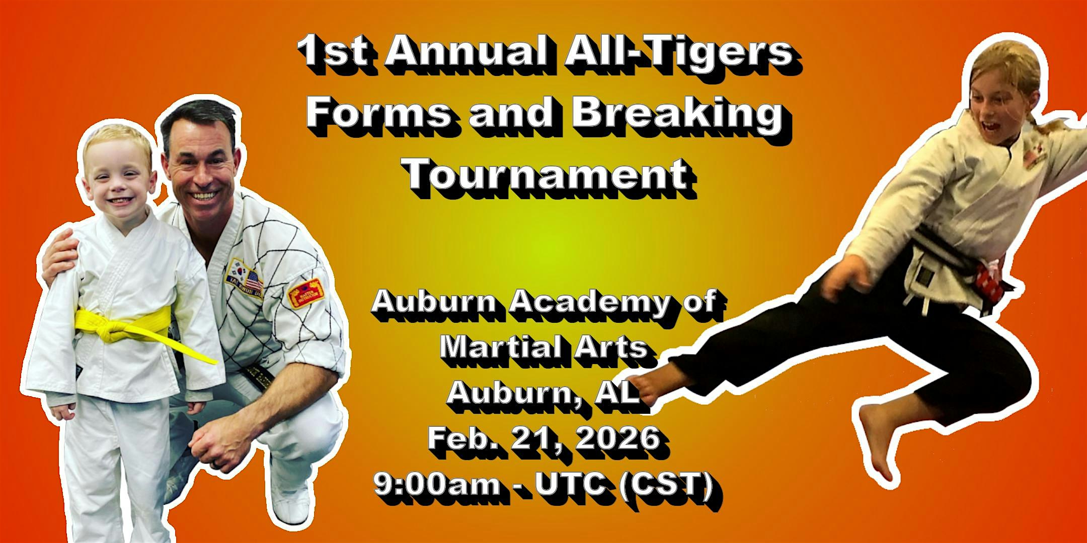 by admin12Feb 1st Annual All-Tigers Forms and Breaking Tournament at Auburn Academy of Martial Arts – Auburn, AL 1st Annual All-Tigers Forms and Breaking Tournament at Auburn Academy of Martial Arts – Auburn, AL 4 4 people viewed this event. Non-contact demonstration of martial arts skills as the 1st Annual All-Tigers Forms and Breaking Tournament kicks off! Tickets-RSVP Link Date And Time Saturday, February 21st, 2026 03:00 PM (PST) Venue Auburn Academy of Martial Arts Location 323 Airport Road, Auburn, AL 36830 Event Types Sports & Fitness Event Category Alabama Share With Friends Facebook Twitter Linkedin Xing Pinterest Share This Post: