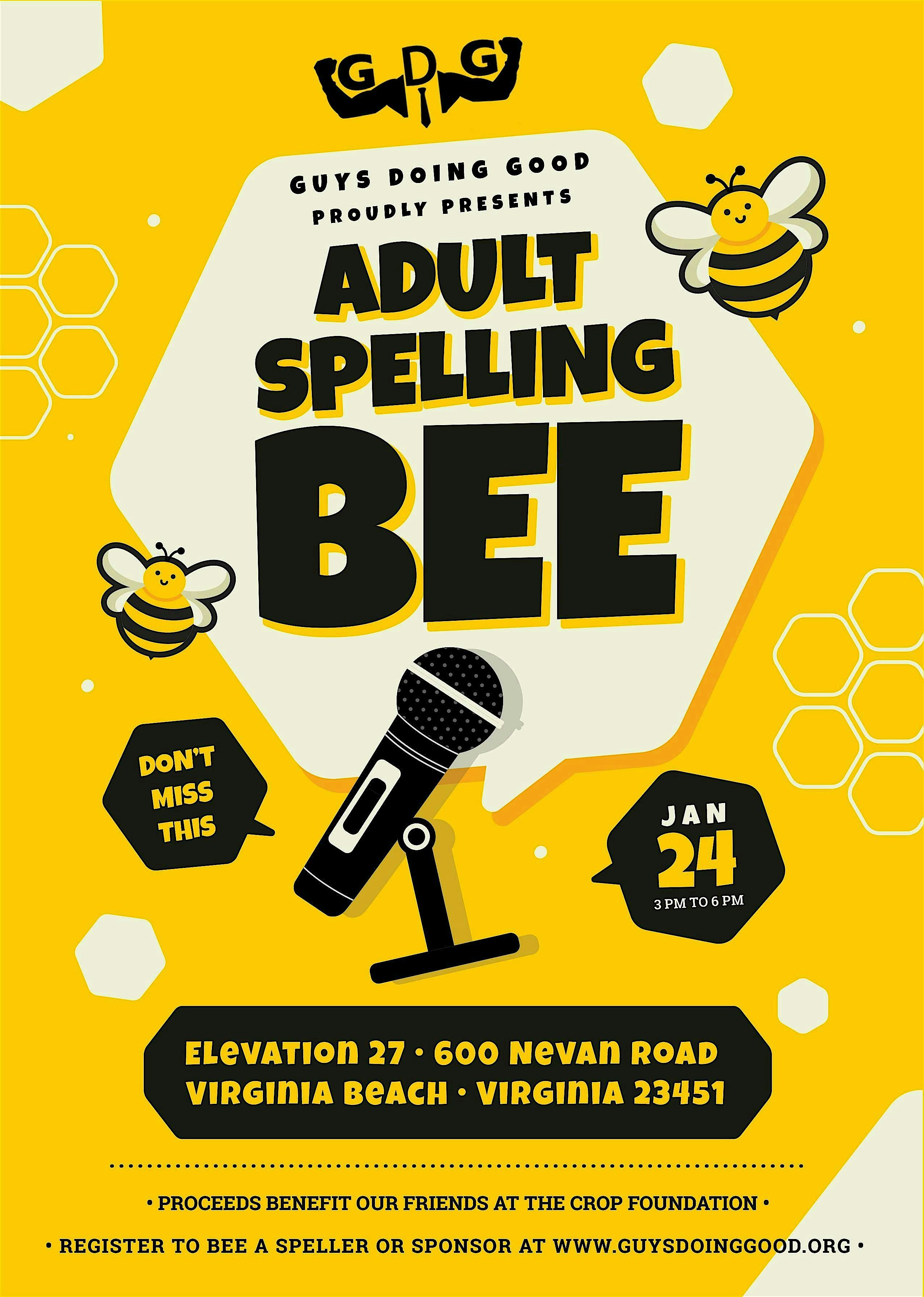 by admin12Feb 2026 6th Annual Guys Doing Good Adult Spelling Bee at Elevation 27 – Virginia Beach, VA 2026 6th Annual Guys Doing Good Adult Spelling Bee at Elevation 27 – Virginia Beach, VA 5 5 people viewed this event. Yes, this is an actual spelling bee, but for adults! Sponsored by Pinpoint IT Services Tickets-RSVP Link Date And Time Saturday, February 21st, 2026 08:00 PM (PST) Venue Elevation 27 Location 600 Nevan Road, Virginia Beach, VA 23451 Event Types Charity & Causes Event Category VirginiaVirginia Beach Share With Friends Facebook Twitter Linkedin Xing Pinterest Share This Post: