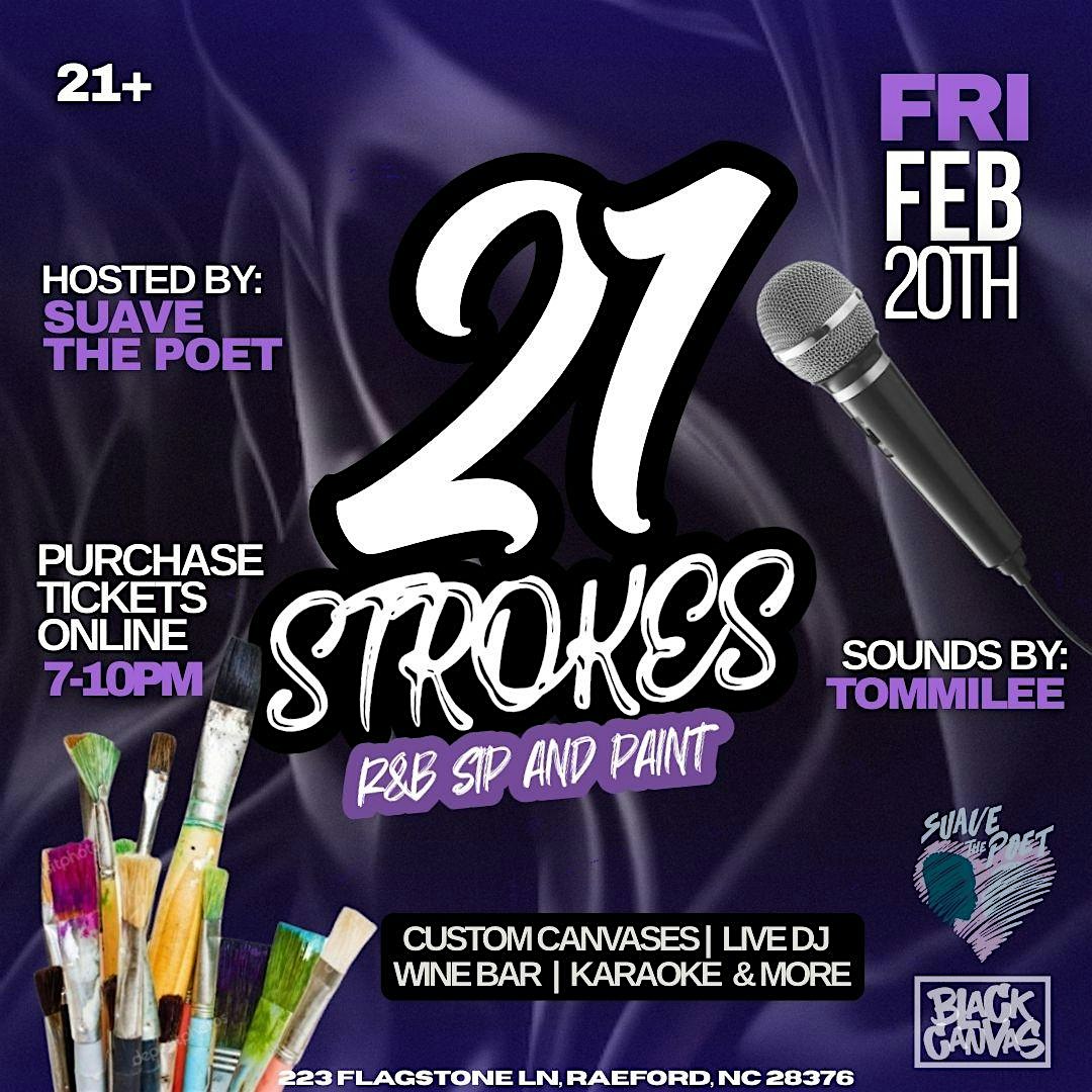 by admin12Feb 21 STROKES – R&B SIP & PAINT at 1910 Wine Nest – Raeford, NC 21 STROKES – R&B SIP & PAINT at 1910 Wine Nest – Raeford, NC 2 2 people viewed this event. Get ready to unleash your inner artist while sipping on your favorite drinks at 21 STROKES – SIP & PAINT NIGHT! Tickets-RSVP Link Date And Time Saturday, February 21st, 2026 12:00 AM (PST) Venue 1910 Wine Nest Location 223 Flagstone Lane, Raeford, NC 28376 Event Types Party or Social GatheringPerforming & Visual Arts Event Category North Carolina Share With Friends Facebook Twitter Linkedin Xing Pinterest Share This Post: