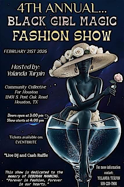 by admin12Feb 4th Annual Black Girl Magic Fashion Show at The Collective – Houston, TX 4th Annual Black Girl Magic Fashion Show at The Collective – Houston, TX 3 3 people viewed this event. Get ready for a night of fierce fashion, empowerment, and celebration of Black girl magic at our 4th Annual Fashion Show! Tickets-RSVP Link Date And Time Saturday, February 21st, 2026 09:00 PM (PST) Venue The Collective Location 12401 South Post Oak Road, Houston, TX 77045 Event Types Fashion & Beauty Event Category HoustonTexas Share With Friends Facebook Twitter Linkedin Xing Pinterest Share This Post: