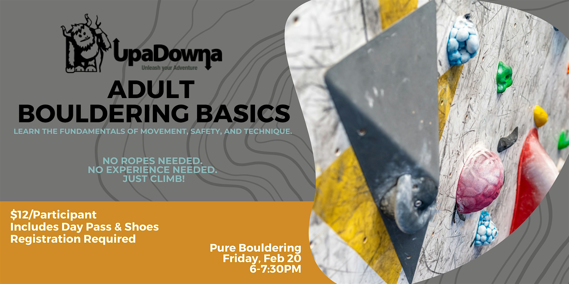 by admin12Feb Adult Bouldering Basics at Pure Bouldering Gym – Colorado Springs, CO Adult Bouldering Basics at Pure Bouldering Gym – Colorado Springs, CO 4 4 people viewed this event. Learn the fundamentals of movement, safety, and technique. No ropes needed. No experience needed. Just climb! Tickets-RSVP Link Date And Time Saturday, February 21st, 2026 01:00 AM (PST) Venue Pure Bouldering Gym Location 1401 South 8th Street, Colorado Springs, CO 80905 Event Category ColoradoColorado Springs Share With Friends Facebook Twitter Linkedin Xing Pinterest Share This Post: