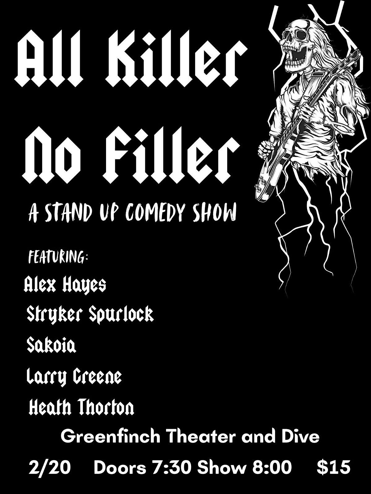 by admin12Feb All Killer No Filler at Greenfinch Theater & Dive – St. Louis, MO All Killer No Filler at Greenfinch Theater & Dive – St. Louis, MO 2 2 people viewed this event. Some killer stand up comics! Tickets-RSVP Link Date And Time Saturday, February 21st, 2026 02:00 AM (PST) Venue Greenfinch Theater & Dive Location 2525 South Jefferson Avenue, St. Louis, MO 63104 Event Types Concert or PerformancePerforming & Visual Arts Event Category MissouriSt. Louis Share With Friends Facebook Twitter Linkedin Xing Pinterest Share This Post: