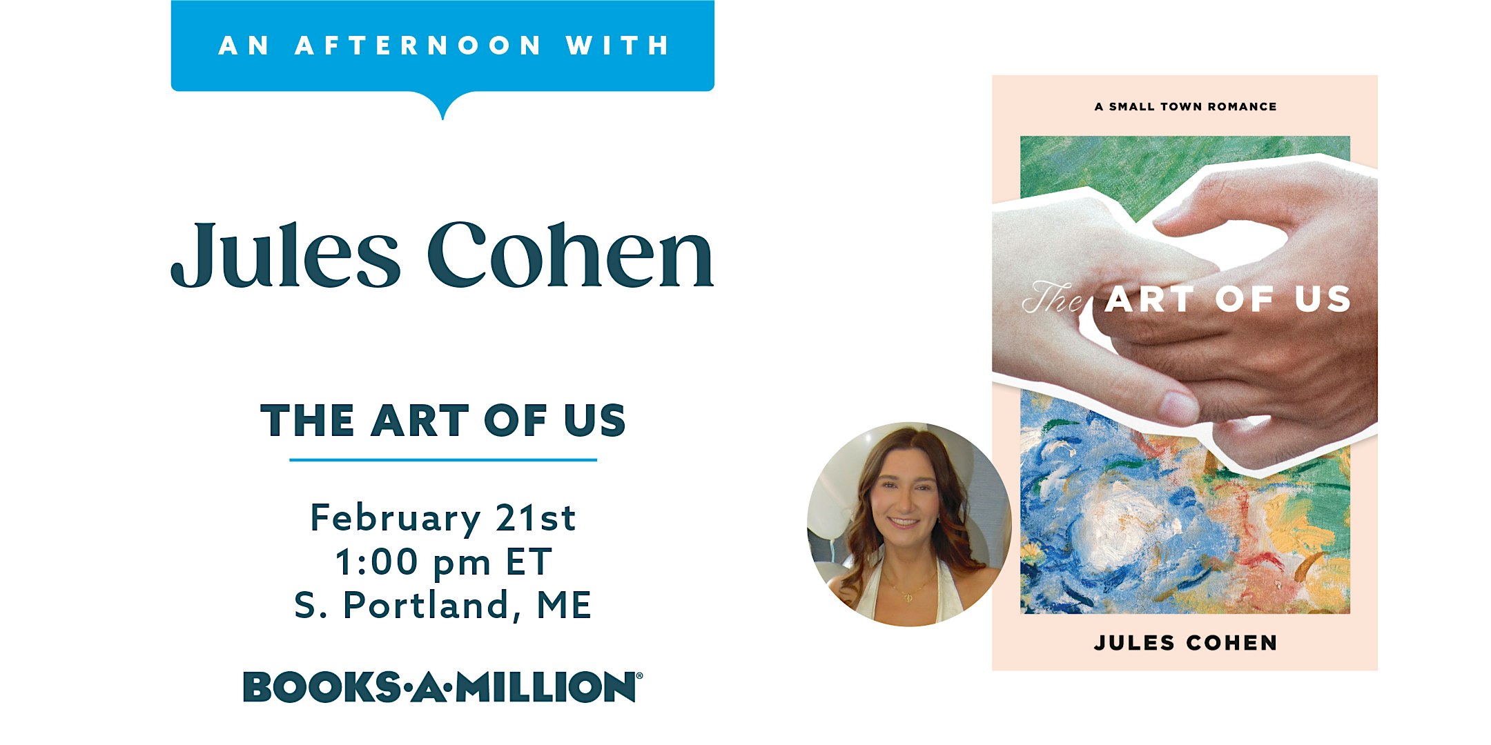 by admin13Feb An Afternoon with Jules Cohen at Books-A-Million – South Portland, ME An Afternoon with Jules Cohen at Books-A-Million – South Portland, ME 2 2 people viewed this event. Calling all romance readers! Local author Jules Cohen will be joining us for an event to sign copies of her new book “The Art of Us”! Tickets-RSVP Link Date And Time Saturday, February 21st, 2026 06:00 PM (PST) Venue Books-A-Million Location 430 Gorham Road, South Portland, ME 4106 Event Types Performing & Visual Arts Event Category Maine Share With Friends Facebook Twitter Linkedin Xing Pinterest Share This Post: