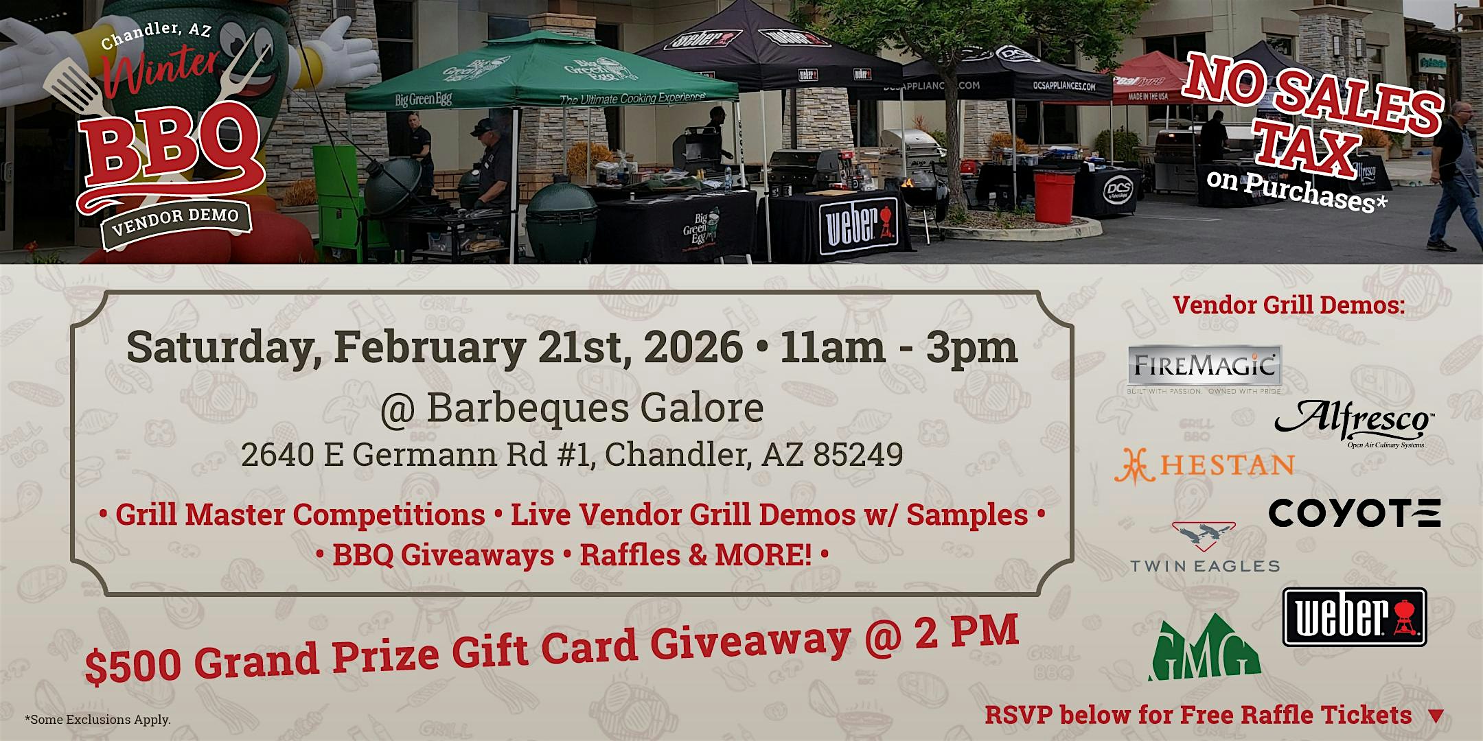 by admin13Feb BBQ Vendor Demo & Sales Event in Chandler, AZ at Barbeques Galore – Chandler, AZ BBQ Vendor Demo & Sales Event in Chandler, AZ at Barbeques Galore – Chandler, AZ 4 4 people viewed this event. BBQ Vendor Demo Day & Sales Event in Chandler, AZ Saturday Feb 21, 2026 Tickets-RSVP Link Date And Time Saturday, February 21st, 2026 06:00 PM (PST) Venue Barbeques Galore Location 2640 East Germann Road, Chandler, AZ 85249 Event Types Food & DrinkParty or Social Gathering Event Category Arizona Share With Friends Facebook Twitter Linkedin Xing Pinterest Share This Post: