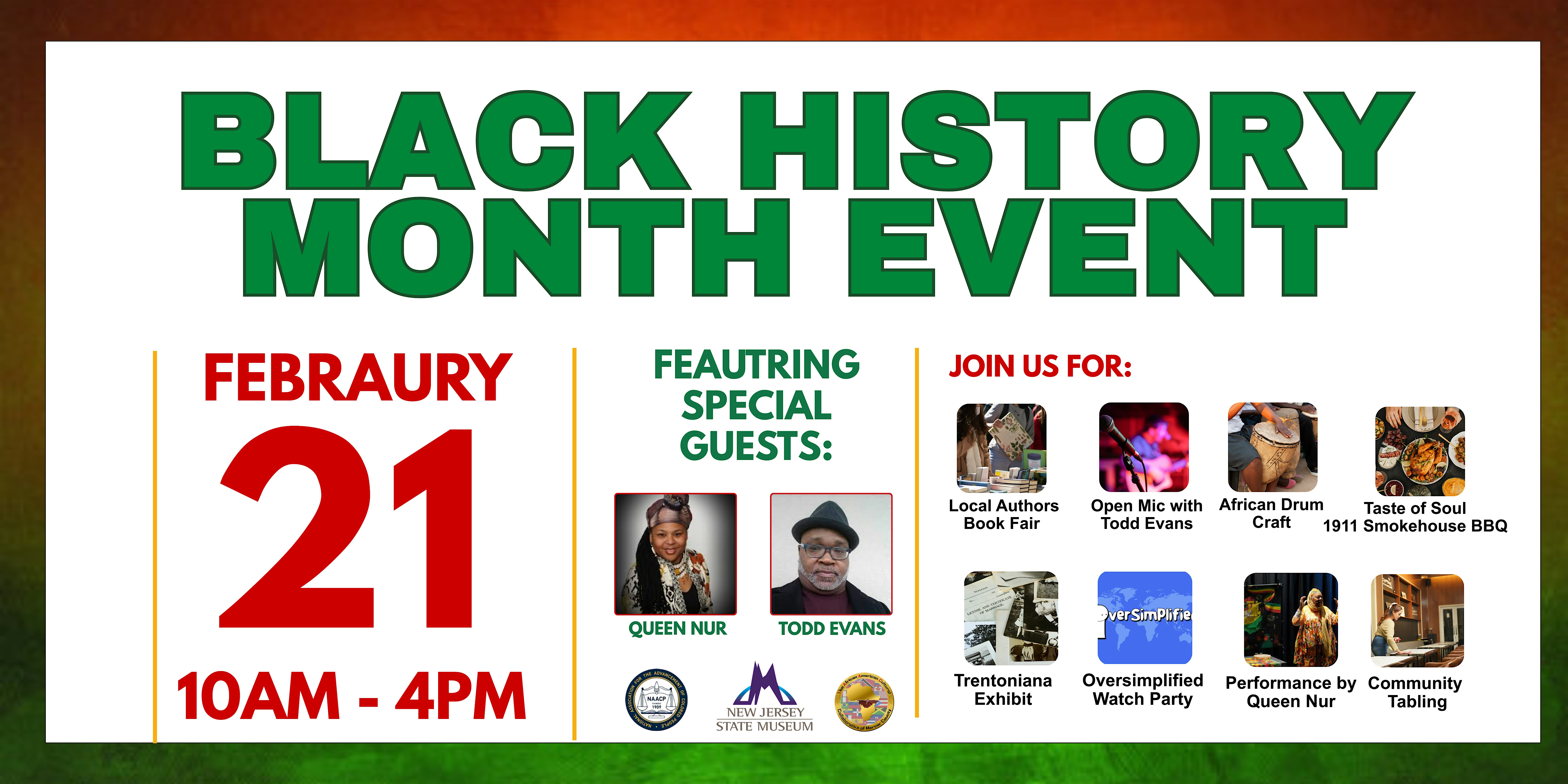 by admin13Feb Black History Month Event at Trenton Free Public Library – Trenton, NJ Black History Month Event at Trenton Free Public Library – Trenton, NJ 3 3 people viewed this event. Celebrate Black History Month with stories, music, and fun vibes all in person! Tickets-RSVP Link Date And Time Saturday, February 21st, 2026 03:00 PM (PST) Venue Trenton Free Public Library Location 120 Academy Street, Trenton, NJ 8608 Event Types Community & CultureParty or Social Gathering Event Category New Jersey Share With Friends Facebook Twitter Linkedin Xing Pinterest Share This Post: