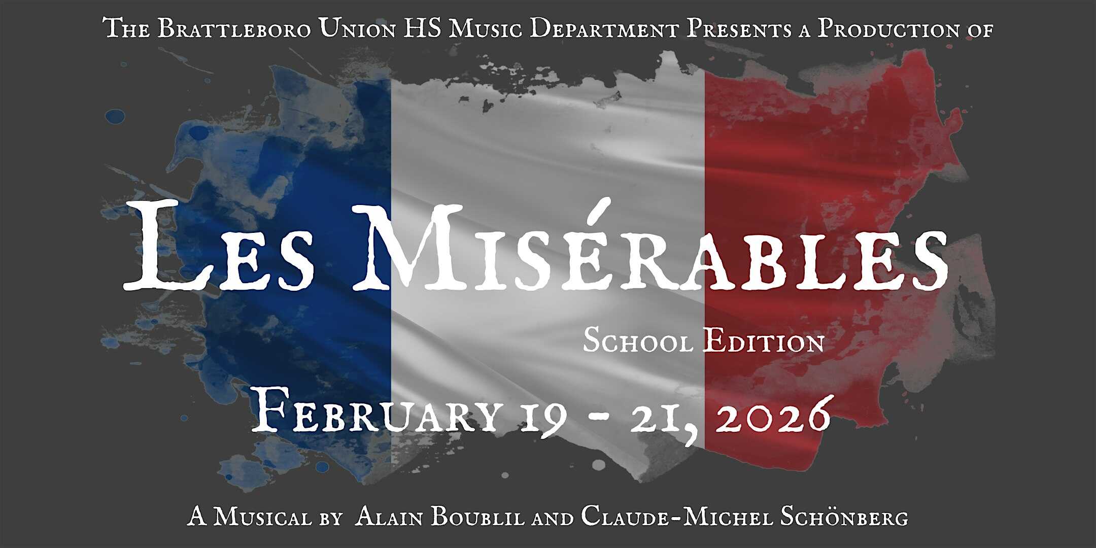 by admin14Feb BUHS Presents Les Misérables: School Edition at Brattleboro Union High School – Brattleboro, VT BUHS Presents Les Misérables: School Edition at Brattleboro Union High School – Brattleboro, VT 3 3 people viewed this event. BUHS Music department presents Les Mis Tickets-RSVP Link Date And Time Saturday, February 21st, 2026 12:00 AM (PST) Venue Brattleboro Union High School Location 131 Fairground Road, Brattleboro, VT 5301 Event Types Concert or PerformancePerforming & Visual Arts Event Category Vermont Share With Friends Facebook Twitter Linkedin Xing Pinterest Share This Post: