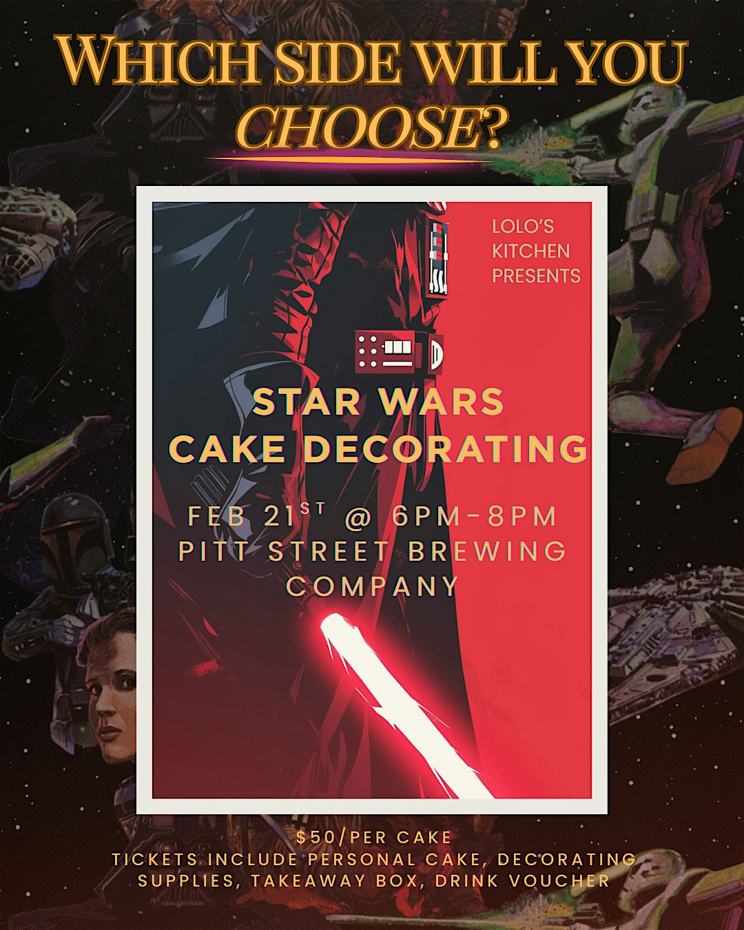 by admin13Feb Cake + Sip: Star Wars Cake Decorating at Pitt Street Brewing Company – Greenville, NC Cake + Sip: Star Wars Cake Decorating at Pitt Street Brewing Company – Greenville, NC 2 2 people viewed this event. ⭐️ Cake included ⭐️ All supplies provided ⭐️ Take-away box ⭐️ Drink voucher ⭐️ Limited seating available, so grab your tickets soon! Tickets-RSVP Link Date And Time Saturday, February 21st, 2026 11:00 PM (PST) Venue Pitt Street Brewing Company Location 630 South Pitt Street, Greenville, NC 27834 Event Types Food & Drink Event Category North Carolina Share With Friends Facebook Twitter Linkedin Xing Pinterest Share This Post: