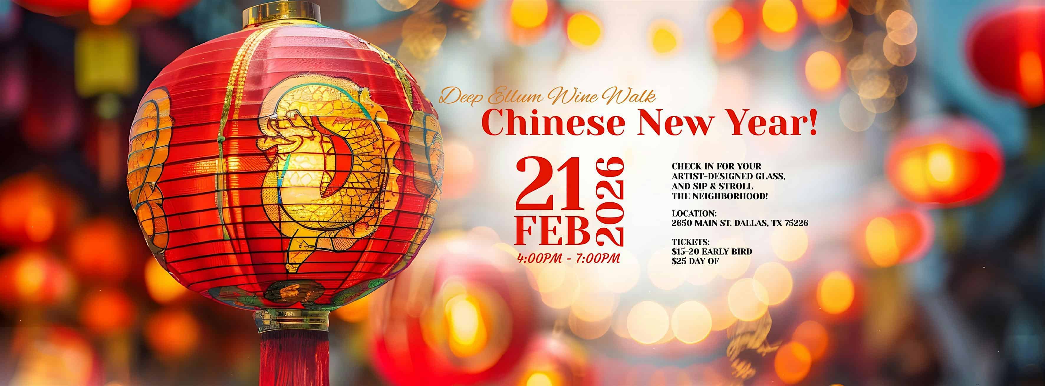 by admin14Feb Chinese New Year! Wine Walk at Discover Deep Ellum – Dallas, TX Chinese New Year! Wine Walk at Discover Deep Ellum – Dallas, TX 1 1 people viewed this event. Gallop into the Year of the Fire Horse with a fun and festive stroll through neighborhood hot spots! Tickets-RSVP Link Date And Time Saturday, February 21st, 2026 10:00 PM (PST) Venue Discover Deep Ellum Location 2650 Main Street, Dallas, TX 75226 Event Types Food & DrinkParty or Social Gathering Event Category DallasTexas Share With Friends Facebook Twitter Linkedin Xing Pinterest Share This Post: