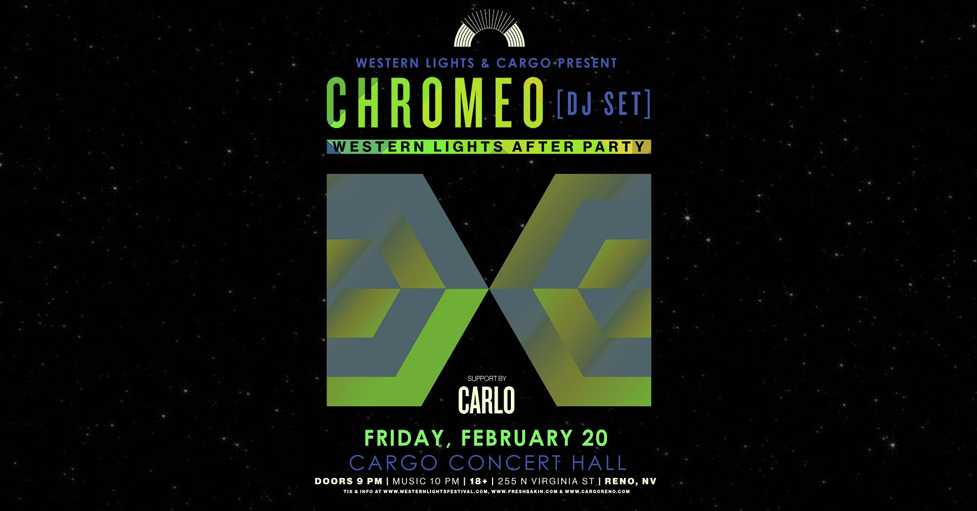 by admin12Feb Chromeo at Cargo Concert Hall at Cargo : Whitney Peak Hotel – Reno, NV Chromeo at Cargo Concert Hall at Cargo : Whitney Peak Hotel – Reno, NV 6 6 people viewed this event. Fresh Bakin’ and Cargo Concert Hall present Chromeo and special guest Carlo! Tickets-RSVP Link Date And Time Saturday, February 21st, 2026 05:00 AM (PST) Venue Cargo : Whitney Peak Hotel Location 255 North Virginia Street, Reno, NV 89501 Event Types Concert or PerformanceMusic Event Category NevadaReno Share With Friends Facebook Twitter Linkedin Xing Pinterest Share This Post: