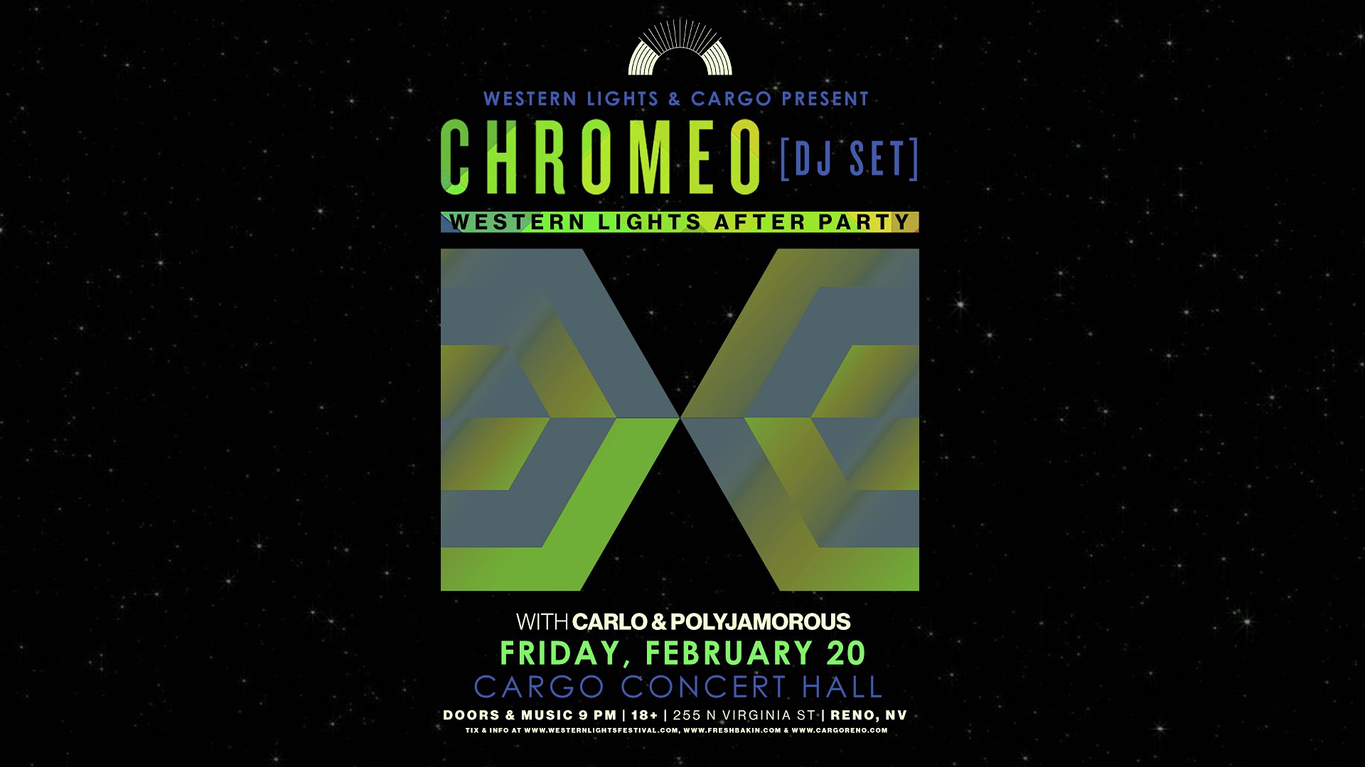 by admin12Feb Chromeo (DJ Set) at Cargo [Western Lights Afterparty] at Cargo : Whitney Peak Hotel – Reno, NV Chromeo (DJ Set) at Cargo [Western Lights Afterparty] at Cargo : Whitney Peak Hotel – Reno, NV 4 4 people viewed this event. Chromeo returns to Reno to perform on February 20th, 2026 as an afterparty at Western Lights Illuminated Arts Festival at Cargo. Tickets-RSVP Link Date And Time Saturday, February 21st, 2026 06:00 AM (PST) Venue Cargo : Whitney Peak Hotel Location 255 North Virginia Street, Reno, NV 89501 Event Types Concert or PerformanceMusic Event Category NevadaReno Share With Friends Facebook Twitter Linkedin Xing Pinterest Share This Post: