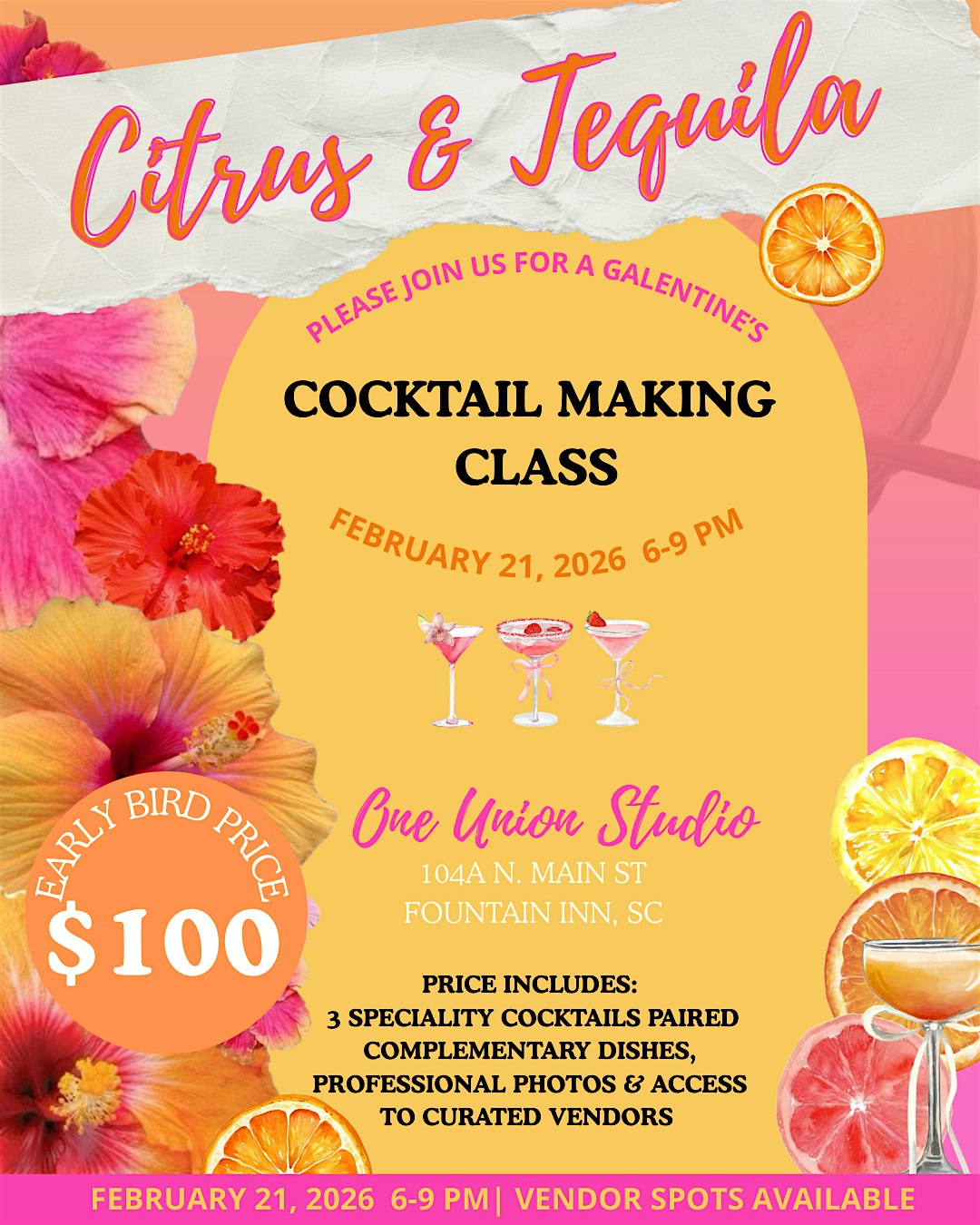 by admin12Feb Citrus and Tequila Galentine’s Cocktail Making Class at One Union Studios – Fountain Inn, SC Citrus and Tequila Galentine’s Cocktail Making Class at One Union Studios – Fountain Inn, SC 3 3 people viewed this event. Sip, snack & vibe at our Galentine’s tequila social hour—crafted cocktails, cute bites, vendors, photo moments & sisterhood energy. Tickets-RSVP Link Date And Time Saturday, February 21st, 2026 11:00 PM (PST) Venue One Union Studios Location 104A North Main Street, Fountain Inn, SC 29644 Event Types Food & Drink Event Category South Carolina Share With Friends Facebook Twitter Linkedin Xing Pinterest Share This Post: