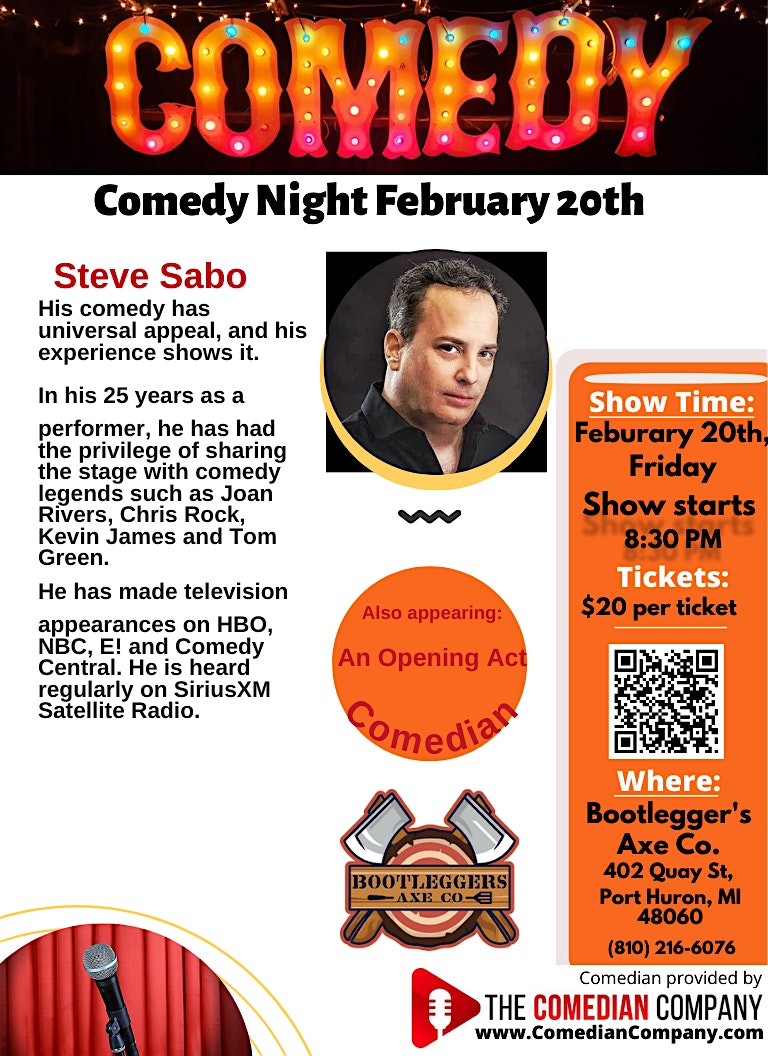 by admin12Feb Copy of Comedy Night with Steve Sabo @ Bootleggers Axe Co. at 402 Quay Street, Port Huron, MI, USA – Port Huron, MI Copy of Comedy Night with Steve Sabo @ Bootleggers Axe Co. at 402 Quay Street, Port Huron, MI, USA – Port Huron, MI 1 1 people viewed this event. Get ready to laugh until your sides hurt at Comedy Night @ Bootleggers Axe Co., where the jokes are as sharp as the axes! Tickets-RSVP Link Date And Time Saturday, February 21st, 2026 01:00 AM (PST) Venue 402 Quay Street, Port Huron, MI, USA Location 402 Quay Street, Port Huron, MI 48060 Event Types Concert or PerformancePerforming & Visual Arts Event Category Michigan Share With Friends Facebook Twitter Linkedin Xing Pinterest Share This Post: