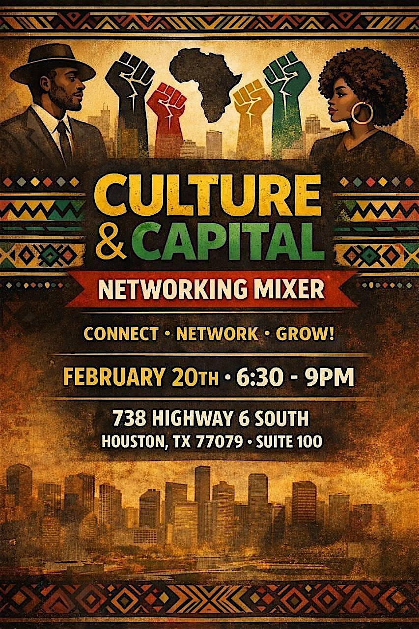 by admin13Feb Culture & Capital Networking Event at 738 S Texas 6 – Houston, TX Culture & Capital Networking Event at 738 S Texas 6 – Houston, TX 1 1 people viewed this event. Connect with entrepreneurs, professionals, and creatives at Culture & Capital. Build relationships, exchange ideas, and grow together. Tickets-RSVP Link Date And Time Saturday, February 21st, 2026 12:00 AM (PST) Venue 738 S Texas 6 Location 738 South Texas 6, Houston, TX 77079 Event Types Community & Culture Event Category HoustonTexas Share With Friends Facebook Twitter Linkedin Xing Pinterest Share This Post: