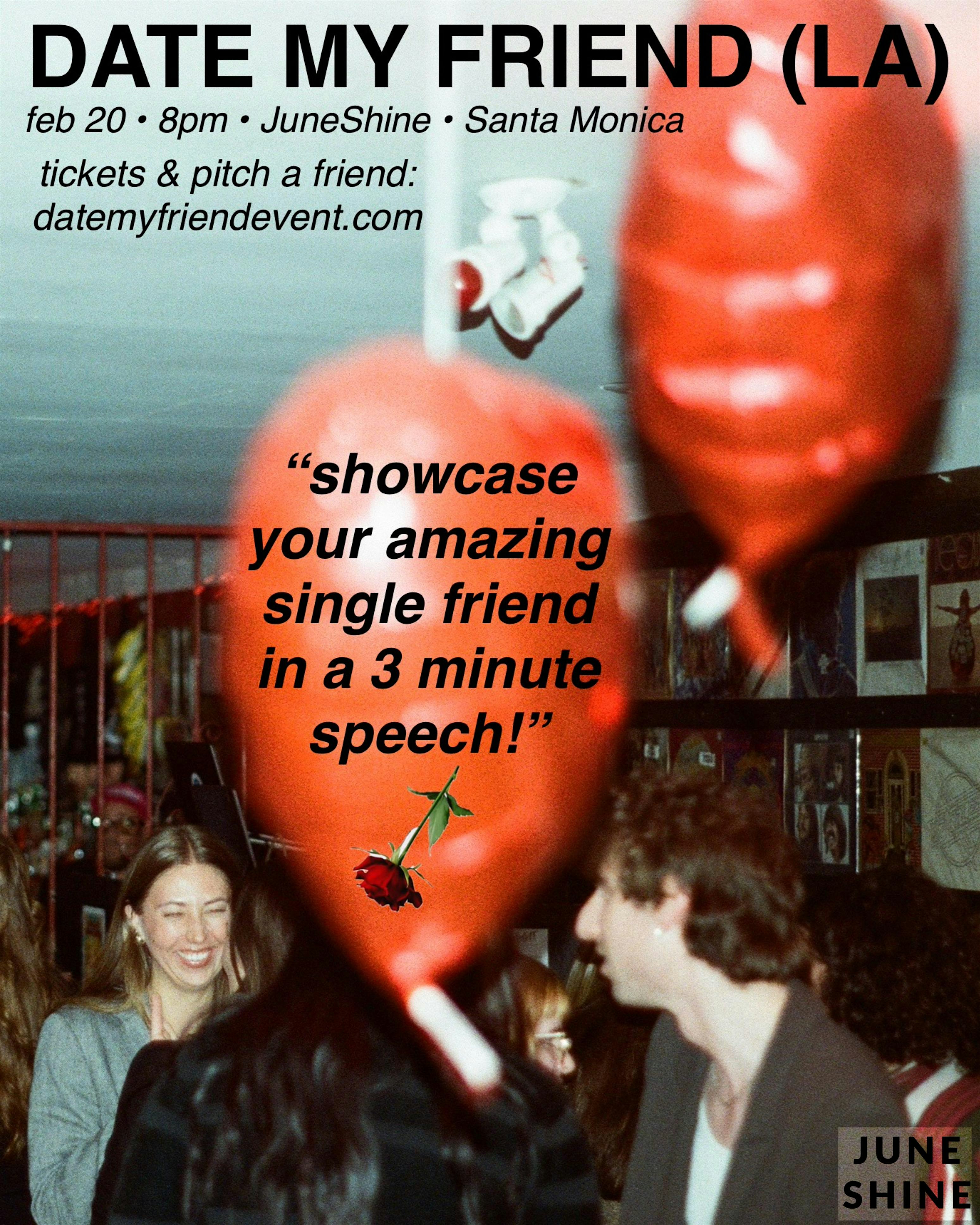 by admin12Feb DATE MY FRIEND (LA) at JuneShine – Santa Monica – Santa Monica, CA DATE MY FRIEND (LA) at JuneShine – Santa Monica – Santa Monica, CA 6 6 people viewed this event. Date My Friend (LA) aims to bring people together offline. Pitch your single friend live on stage in front of an audience, mingle after. Tickets-RSVP Link Date And Time Saturday, February 21st, 2026 04:00 AM (PST) Venue JuneShine - Santa Monica Location 2914 Main Street, Santa Monica, CA 90405 Event Types Community & CultureParty or Social Gathering Event Category CaliforniaLos Angeles Share With Friends Facebook Twitter Linkedin Xing Pinterest Share This Post: