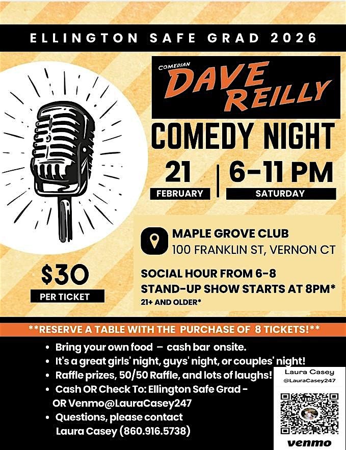 by admin12Feb Dave Reilly Comedy Show-Ellington Safe Graduation Fundraiser at Maple Grove Club – Vernon, CT Dave Reilly Comedy Show-Ellington Safe Graduation Fundraiser at Maple Grove Club – Vernon, CT 6 6 people viewed this event. Laugh out loud with Dave Reilly. Join the Ellington community to raise fund for the annual Safe Graduation event. Tickets-RSVP Link Date And Time Saturday, February 21st, 2026 11:00 PM (PST) Venue Maple Grove Club Location 100 Franklin Street, Vernon, CT 6066 Event Types Concert or PerformancePerforming & Visual Arts Event Category Connecticut Share With Friends Facebook Twitter Linkedin Xing Pinterest Share This Post: