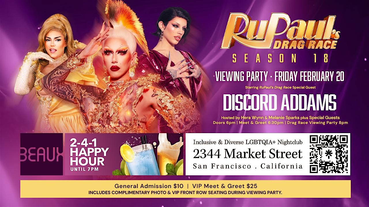 by admin12Feb Discord Addams Rupaul’s Drag Race Season 18 viewing party Friday Feb 20 at Beaux – San Francisco, CA Discord Addams Rupaul’s Drag Race Season 18 viewing party Friday Feb 20 at Beaux – San Francisco, CA 6 6 people viewed this event. Discord Addams is our special guest for the Rupaul’s Drag Race S18 viewing party hosted by Hera Wynn and Melanie Sparks Friday Feb 20th Tickets-RSVP Link Date And Time Saturday, February 21st, 2026 02:00 AM (PST) Venue Beaux Location 2344 Market Street, San Francisco, CA 94114 Event Types Community & CultureParty or Social Gathering Event Category CaliforniaSan Francisco Share With Friends Facebook Twitter Linkedin Xing Pinterest Share This Post: