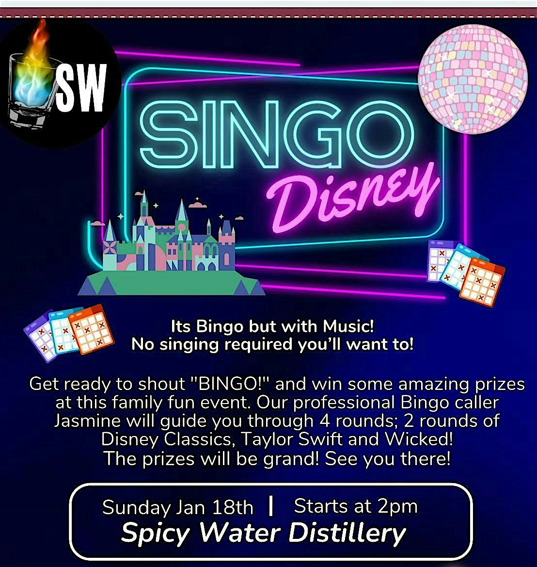 by admin12Feb Disney Singo at the Spicy Water Distillery at Spicy Water Distillery – Millbury, MA Disney Singo at the Spicy Water Distillery at Spicy Water Distillery – Millbury, MA 2 2 people viewed this event. Its Bingo but with Music! No singing required you’ll want to! Tickets-RSVP Link Date And Time Saturday, February 21st, 2026 07:00 PM (PST) Venue Spicy Water Distillery Location 108 Elm Street, Millbury, MA 1527 Event Types Music Event Category Massachusetts Share With Friends Facebook Twitter Linkedin Xing Pinterest Share This Post: