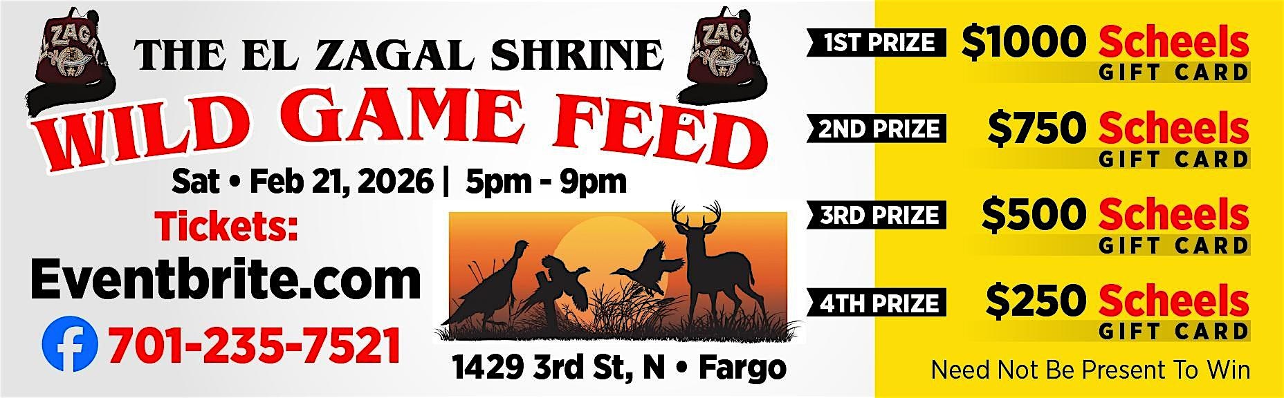 by admin12Feb El Zagal Wild Game Feed 2026 at El Zagal Shrine Fargo – Fargo, ND El Zagal Wild Game Feed 2026 at El Zagal Shrine Fargo – Fargo, ND 2 2 people viewed this event. Get ready for a wild game feed at the El Zagal Shrine February 21st, 2026 – a foodie adventure you won’t want to miss! Tickets-RSVP Link Date And Time Saturday, February 21st, 2026 10:00 PM (PST) Venue El Zagal Shrine Fargo Location 1429 3rd Street North, Fargo, ND 58102 Event Types Food & DrinkParty or Social Gathering Event Category FargoNorth Dakota Share With Friends Facebook Twitter Linkedin Xing Pinterest Share This Post: