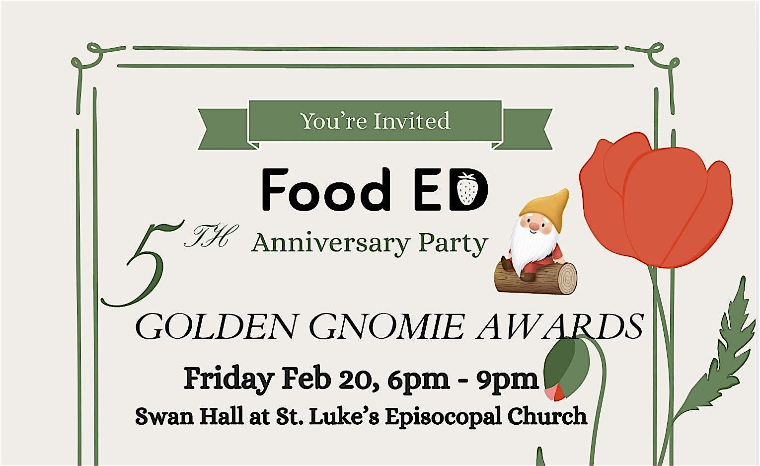 by admin12Feb Food ED 5th Anniversary Golden Gnomies at 122 California Ave – Monrovia, CA Food ED 5th Anniversary Golden Gnomies at 122 California Ave – Monrovia, CA 4 4 people viewed this event. Celebrate 5 years of Food ED with the Golden Gnomie Awards – Good food, great success, and amazing people! Tickets-RSVP Link Date And Time Saturday, February 21st, 2026 02:00 AM (PST) Venue 122 California Ave Location 122 California Avenue, Monrovia, CA 91016 Event Types Charity & CausesParty or Social Gathering Event Category CaliforniaLos Angeles Share With Friends Facebook Twitter Linkedin Xing Pinterest Share This Post: