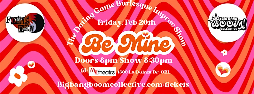 by admin12Feb Foxy’s Den: Be Mine at ME Theatre – Orlando, FL Foxy’s Den: Be Mine at ME Theatre – Orlando, FL 2 2 people viewed this event. Foxy’s Den Presents BE MINE! Disastrous first dates, cheeky rejections, ghosting, and true love – you pick the performer, song, and more! Tickets-RSVP Link Date And Time Saturday, February 21st, 2026 01:00 AM (PST) Venue ME Theatre Location 1300 La Quinta Drive, Orlando, FL 32809 Event Types Concert or PerformancePerforming & Visual Arts Event Category FloridaOrlando Share With Friends Facebook Twitter Linkedin Xing Pinterest Share This Post: