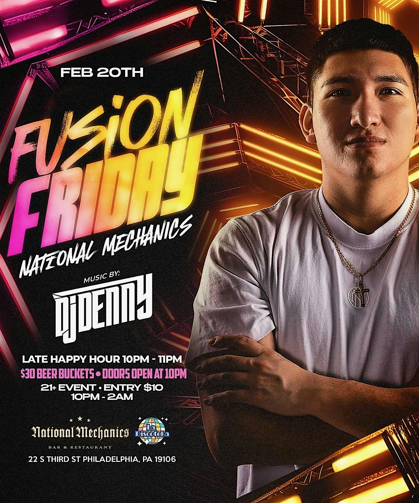 by admin12Feb Fusion Friday with DJ Denny at National Mechanics Bar and Restaurant – Philadelphia, PA Fusion Friday with DJ Denny at National Mechanics Bar and Restaurant – Philadelphia, PA 4 4 people viewed this event. Late happy hour 10pm – 11pm | $30 Beer Buckets |Doors open at 10pm | 21+ Event | Entry $10 | 10pm – 2am Tickets-RSVP Link Date And Time Saturday, February 21st, 2026 03:00 AM (PST) Venue National Mechanics Bar and Restaurant Location 22 South 3rd Street, Philadelphia, PA 19106 Event Types Concert or PerformanceMusic Event Category PennsylvaniaPhiladelphia Share With Friends Facebook Twitter Linkedin Xing Pinterest Share This Post: