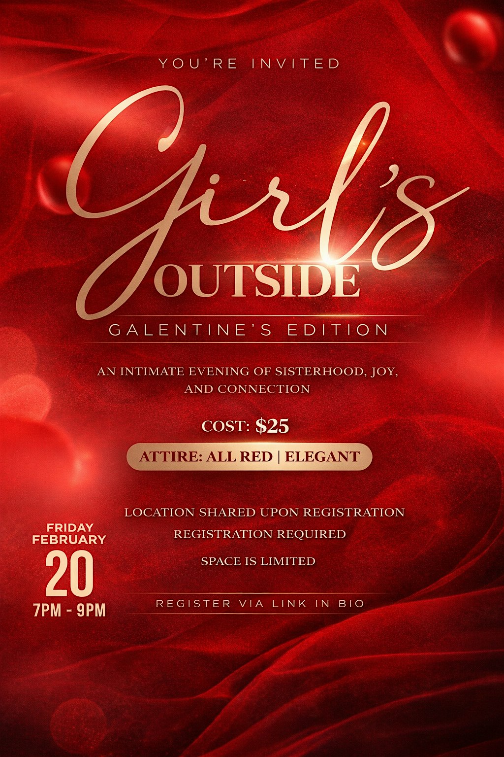by admin12Feb Girls Outside | Galentine’s Edition at 146 W 21st St – Los Angeles, CA Girls Outside | Galentine’s Edition at 146 W 21st St – Los Angeles, CA 7 7 people viewed this event. Girls Outside: Galentine’s Edition Celebrate sisterhood, connection, and self-love. Attire: ALL RED 2/18 last day to purchase your tickets. Tickets-RSVP Link Date And Time Saturday, February 21st, 2026 03:00 AM (PST) Venue 146 W 21st St Location 146 West 21st Street, Los Angeles, CA 90007 Event Types Food & DrinkParty or Social Gathering Event Category CaliforniaLos Angeles Share With Friends Facebook Twitter Linkedin Xing Pinterest Share This Post: