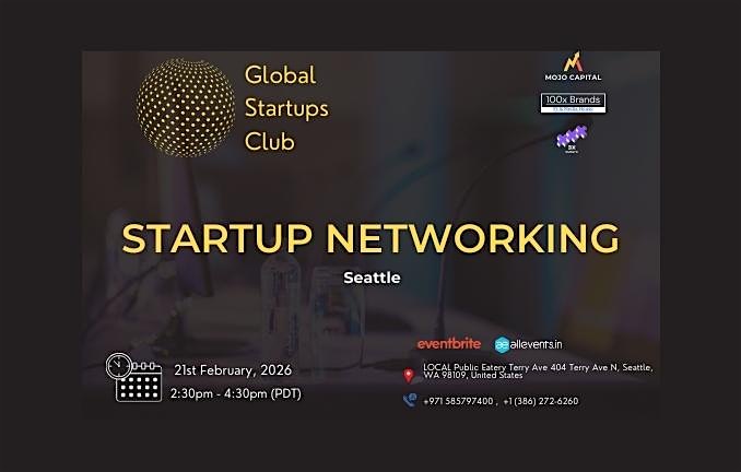 by admin13Feb GLOBAL STARTUPS CLUB l STARTUP NETWORKING Seattle 2026 at LOCAL Public Eatery Terry Ave – Seattle, WA GLOBAL STARTUPS CLUB l STARTUP NETWORKING Seattle 2026 at LOCAL Public Eatery Terry Ave – Seattle, WA 2 2 people viewed this event. Innovate. Network. Execute. Tickets-RSVP Link Date And Time Saturday, February 21st, 2026 10:00 PM (PST) Venue LOCAL Public Eatery Terry Ave Location 404 Terry Avenue North, Seattle, WA 98109 Event Category SeattleWashington Share With Friends Facebook Twitter Linkedin Xing Pinterest Share This Post: