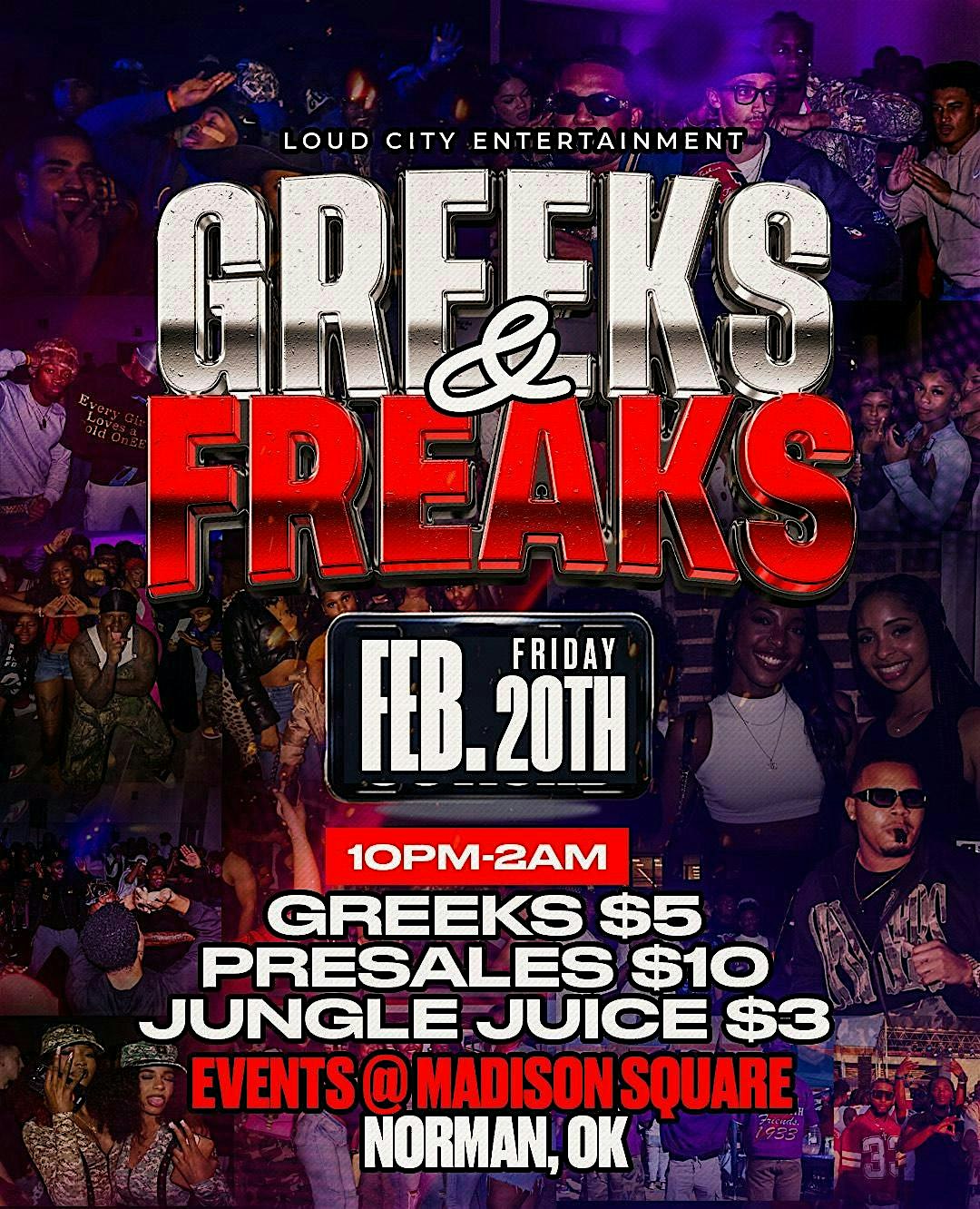by admin12Feb GREEKS & FREAKS at Events @ Madison Square – Norman, OK GREEKS & FREAKS at Events @ Madison Square – Norman, OK 1 1 people viewed this event. FEB 20TH- NORMAN, OK Tickets-RSVP Link Date And Time Saturday, February 21st, 2026 04:00 AM (PST) Venue Events @ Madison Square Location 480 24th Avenue Northwest, Norman, OK 73069 Event Types OtherParty or Social Gathering Event Category OklahomaOklahoma City Share With Friends Facebook Twitter Linkedin Xing Pinterest Share This Post: