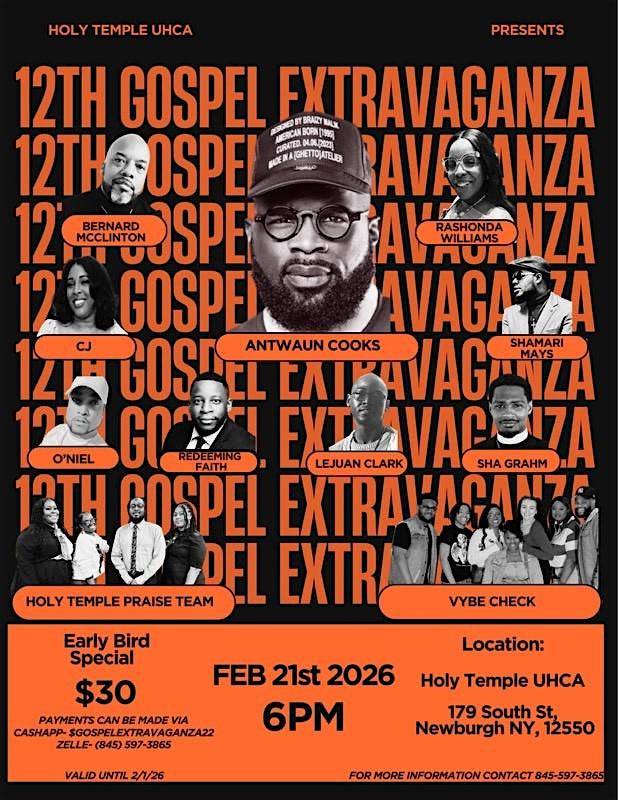 by admin13Feb Holy Temple 12th Annual Gospel Extravaganza at Holy Temple UHCA – Newburgh, NY Holy Temple 12th Annual Gospel Extravaganza at Holy Temple UHCA – Newburgh, NY 2 2 people viewed this event. Get ready for a powerful night of praise, worship, and gospel excellence! Join us as Antwaun Cooks headlines an unforgettable experience. Tickets-RSVP Link Date And Time Saturday, February 21st, 2026 11:00 PM (PST) Venue Holy Temple UHCA Location 179 South St, Newburgh, NY 12550 Event Types Concert or PerformanceMusic Event Category New York Share With Friends Facebook Twitter Linkedin Xing Pinterest Share This Post: