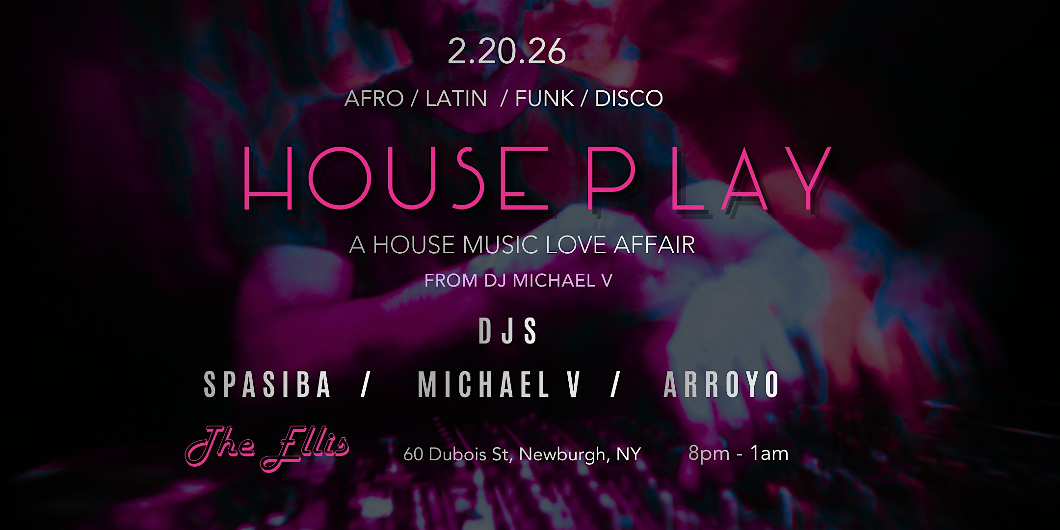 by admin13Feb House Play at The Ellis: A Two-Peak House Music Experience at The Ellis – Newburgh, NY House Play at The Ellis: A Two-Peak House Music Experience at The Ellis – Newburgh, NY 2 2 people viewed this event. House Play is a warm, inclusive house music dance party with two peaks of energy, curated DJs, and a feel-good dance floor. Tickets-RSVP Link Date And Time Saturday, February 21st, 2026 01:00 AM (PST) Venue The Ellis Location 60 Dubois Street, Newburgh, NY 12550 Event Types Concert or PerformanceMusic Event Category New York Share With Friends Facebook Twitter Linkedin Xing Pinterest Share This Post: