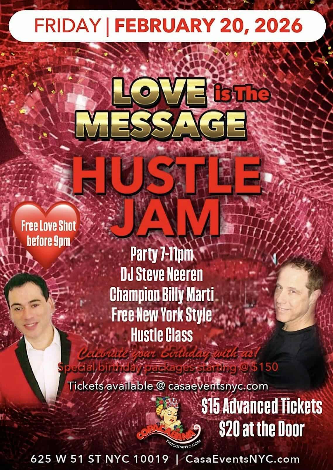 by admin14Feb Hustle Jam NYC-Love is the Message at Casa Events NYC – New York, NY Hustle Jam NYC-Love is the Message at Casa Events NYC – New York, NY 2 2 people viewed this event. Get ready to vibe with the best dance beats in NYC, where love is the ultimate message – it’s gonna be a night to remember! Tickets-RSVP Link Date And Time Saturday, February 21st, 2026 12:00 AM (PST) Venue Casa Events NYC Location 625 West 51st Street, New York, NY 10019 Event Types MusicParty or Social Gathering Event Category New YorkNew York City Share With Friends Facebook Twitter Linkedin Xing Pinterest Share This Post: