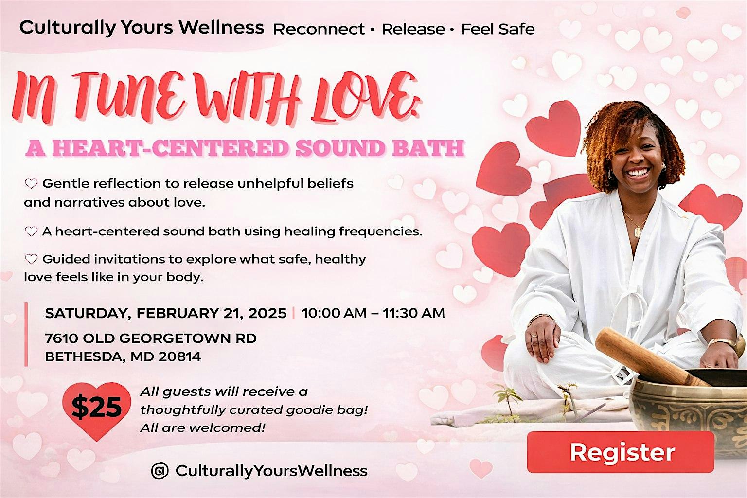 by admin13Feb In Tune With Love: A Heart-Centered Sound Bath at 7610 Old Georgetown Rd – Bethesda, MD In Tune With Love: A Heart-Centered Sound Bath at 7610 Old Georgetown Rd – Bethesda, MD 3 3 people viewed this event. Reconnect with yourself. Release unhelpful love patterns. Learn how love can feel safe in your body. Tickets-RSVP Link Date And Time Saturday, February 21st, 2026 03:00 PM (PST) Venue 7610 Old Georgetown Rd Location 7610 Old Georgetown Road, Bethesda, MD 20814 Event Category MarylandNational Harbor Share With Friends Facebook Twitter Linkedin Xing Pinterest Share This Post: