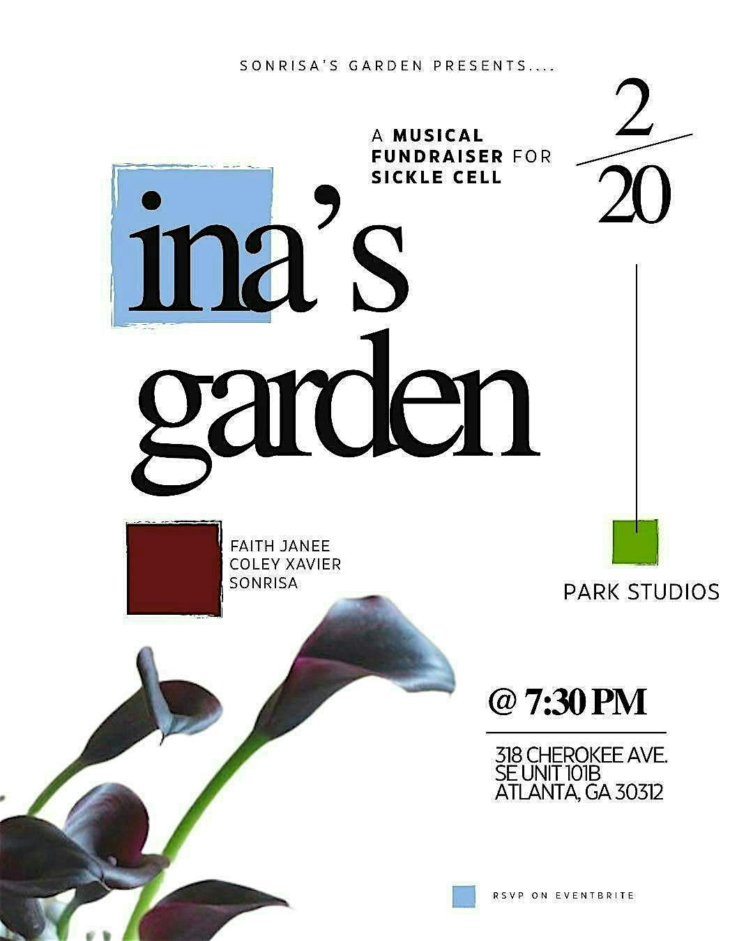 by admin12Feb Ina’s Garden at Park Studios 101 – Atlanta, GA Ina’s Garden at Park Studios 101 – Atlanta, GA 5 5 people viewed this event. Ina’s Garden is a musical fundraiser event to help families suffering from the effects of Sickle Cell Anemia! Tickets-RSVP Link Date And Time Saturday, February 21st, 2026 12:00 AM (PST) Venue Park Studios 101 Location 318 Cherokee Avenue Southeast, Atlanta, GA 30312 Event Types Concert or PerformanceOther Event Category AtlantaGeorgia Share With Friends Facebook Twitter Linkedin Xing Pinterest Share This Post: