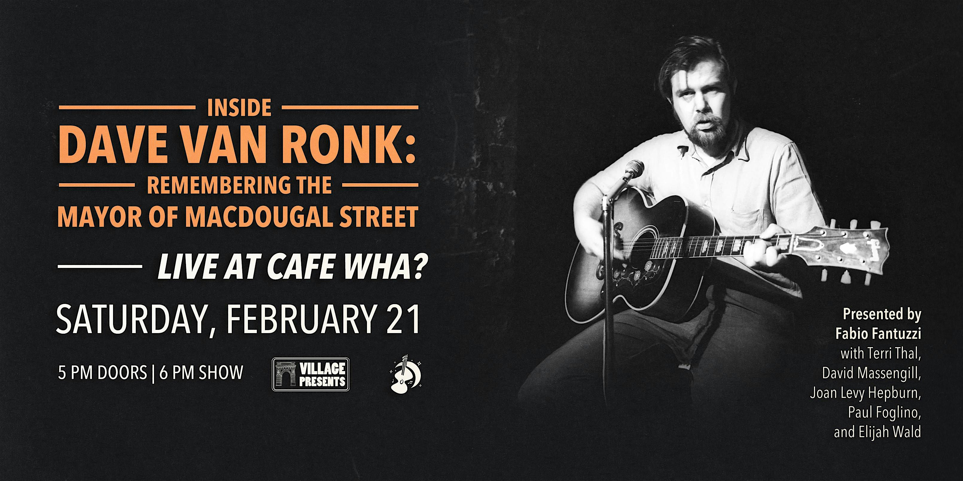 by admin13Feb Inside Dave Van Ronk: Remembering the Mayor of MacDougal Street at Cafe Wha? – New York, NY Inside Dave Van Ronk: Remembering the Mayor of MacDougal Street at Cafe Wha? – New York, NY 2 2 people viewed this event. Inside Dave Van Ronk: Remembering the Mayor of MacDougal Street | Live at Cafe Wha? | Saturday, February 21st| 5PM Doors, 6PM Show Tickets-RSVP Link Date And Time Saturday, February 21st, 2026 11:00 PM (PST) Venue Cafe Wha? Location 115 MacDougal Street, New York, NY 10012 Event Types Concert or PerformanceMusic Event Category New YorkNew York City Share With Friends Facebook Twitter Linkedin Xing Pinterest Share This Post: