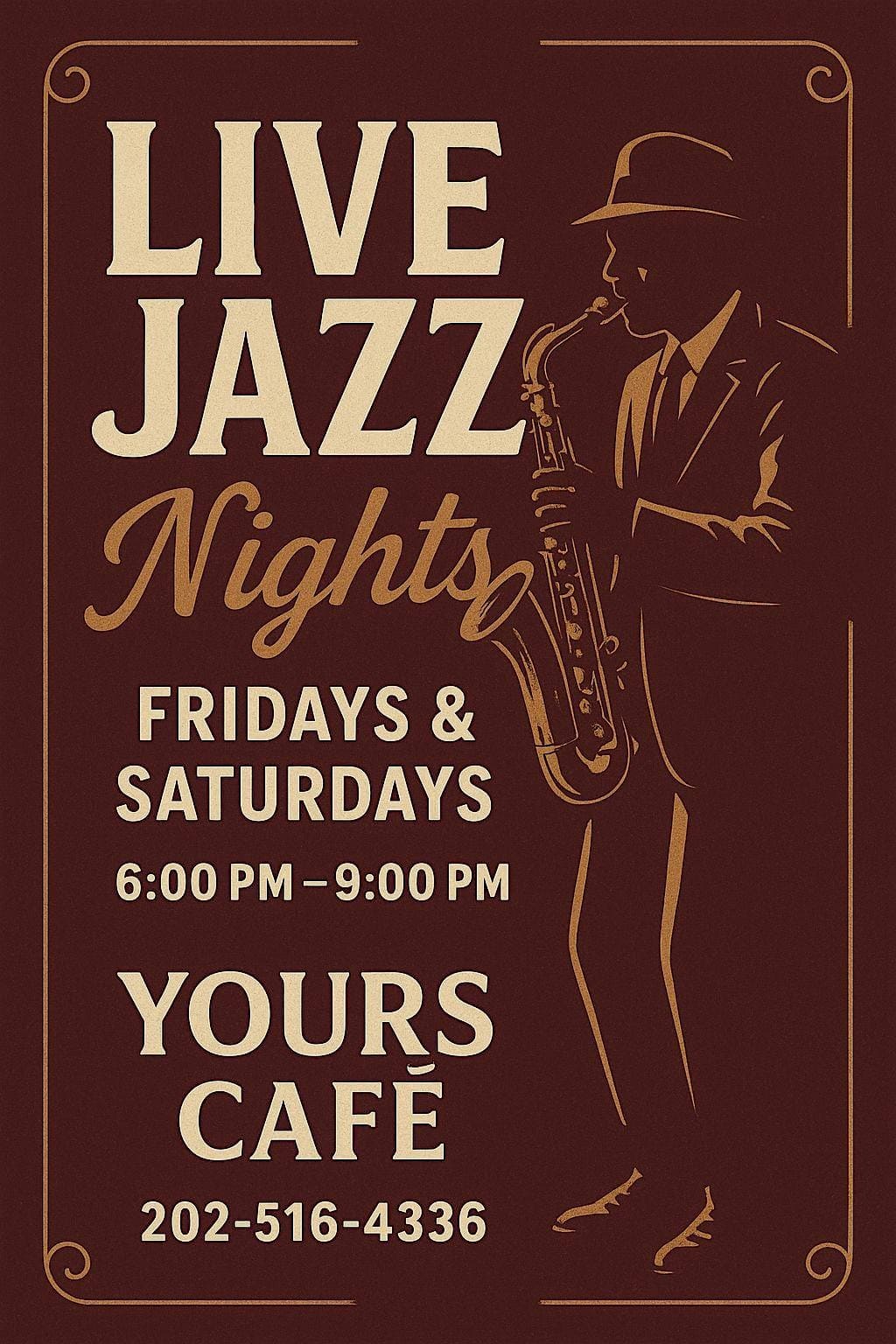 by admin14Feb Jazz Night at Yours Cafe at Yours Cafe – Washington, DC Jazz Night at Yours Cafe at Yours Cafe – Washington, DC 2 2 people viewed this event. Come vibe with smooth jazz tunes and festive cheer at our Jazz Night – good music, good times! Tickets-RSVP Link Date And Time Saturday, February 21st, 2026 12:00 AM (PST) Venue Yours Cafe Location 2619 Connecticut Avenue Northwest, Washington, DC 20008 Event Types Concert or PerformanceFood & Drink Event Category Washington DC Share With Friends Facebook Twitter Linkedin Xing Pinterest Share This Post: