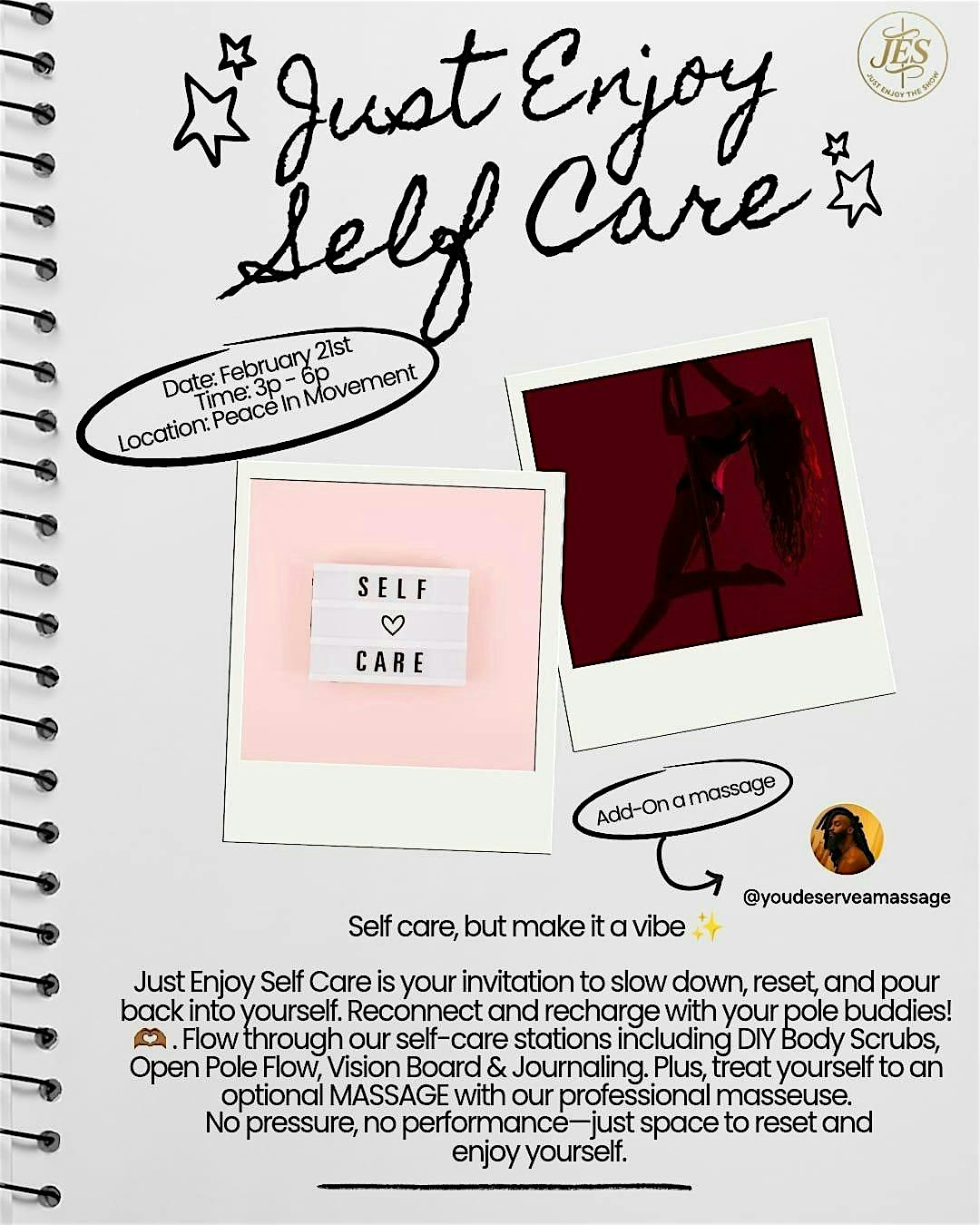 by admin12Feb Just Enjoy Self-Care at Peace in Movement – Silver Spring, MD Just Enjoy Self-Care at Peace in Movement – Silver Spring, MD 3 3 people viewed this event. Just Enjoy Self Care is your invitation to slow down, reset, and pour back into yourself. Reconnect and recharge with your pole buddies! Tickets-RSVP Link Date And Time Saturday, February 21st, 2026 08:00 PM (PST) Venue Peace in Movement Location 8737 Colesville Road, Silver Spring, MD 20910 Event Types Other Event Category MarylandSilver Spring Share With Friends Facebook Twitter Linkedin Xing Pinterest Share This Post: