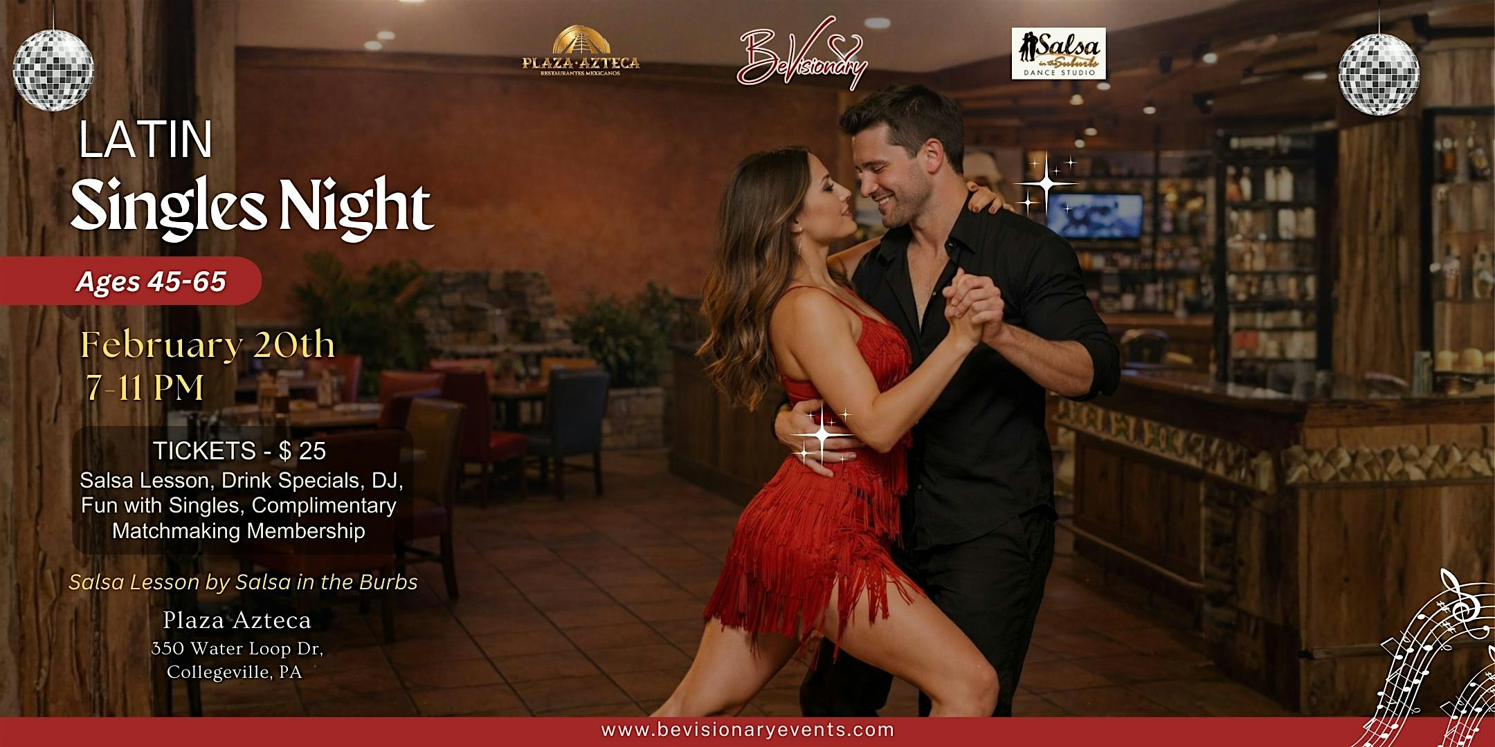 by admin12Feb Latin Singles Night at Plaza Azteca Collegeville – Collegeville, PA Latin Singles Night at Plaza Azteca Collegeville – Collegeville, PA 4 4 people viewed this event. Latin Singles Night (45+) at Plaza Azteca! Feb 20, 7–11 PM. Salsa lesson, DJ, drinks & mingling. Tickets $25. Tickets-RSVP Link Date And Time Saturday, February 21st, 2026 12:00 AM (PST) Venue Plaza Azteca Collegeville Location 350 Water Loop Lane, Collegeville, PA 19426 Event Types Party or Social Gathering Event Category Pennsylvania Share With Friends Facebook Twitter Linkedin Xing Pinterest Share This Post: