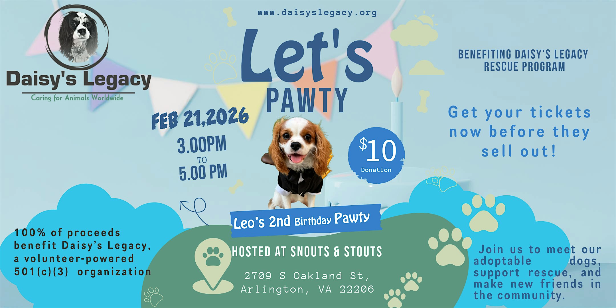 by admin13Feb Leo’s 2nd Birthday Pawty at Snouts & Stouts – Dog Bar – Arlington, VA Leo’s 2nd Birthday Pawty at Snouts & Stouts – Dog Bar – Arlington, VA 3 3 people viewed this event. Celebrate Leo’s 2nd birthday! Join us to support Daisy’s Legacy Rescue Program and help save dogs in need. Tickets-RSVP Link Date And Time Saturday, February 21st, 2026 08:00 PM (PST) Venue Snouts & Stouts - Dog Bar Location 2709 South Oakland Street, Arlington, VA 22206 Event Types Charity & CausesParty or Social Gathering Event Category Virginia Share With Friends Facebook Twitter Linkedin Xing Pinterest Share This Post: