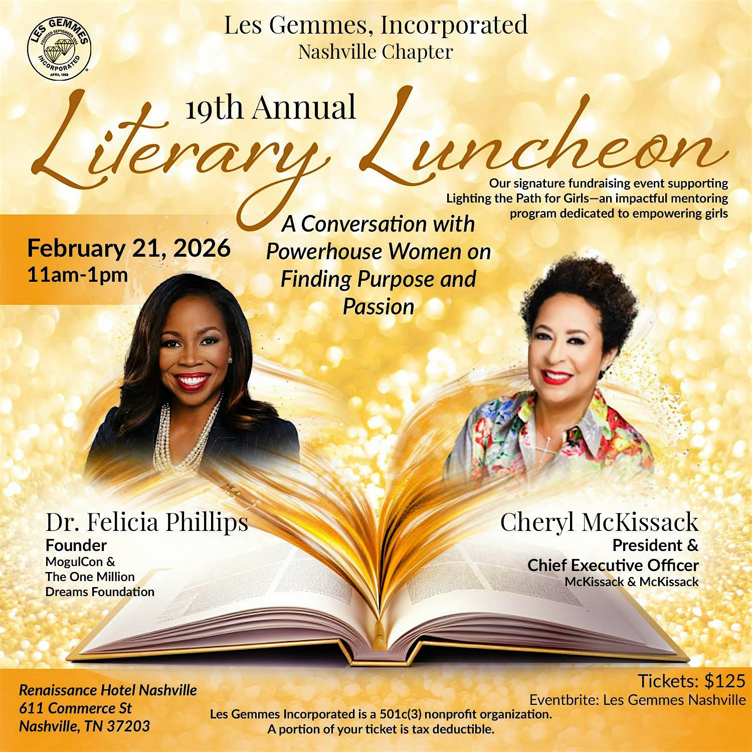 by admin12Feb Les Gemmes 19th Annual Literary Luncheon at Renaissance Nashville Hotel – Nashville, TN Les Gemmes 19th Annual Literary Luncheon at Renaissance Nashville Hotel – Nashville, TN 2 2 people viewed this event. Join us for our annual fundraiser benefitting our Jewels. Enjoy our speaker, entertainment , vendors and more. Tickets-RSVP Link Date And Time Saturday, February 21st, 2026 05:00 PM (PST) Venue Renaissance Nashville Hotel Location 611 Commerce Street, Nashville, TN 37203 Event Types Charity & Causes Event Category NashvilleTennessee Share With Friends Facebook Twitter Linkedin Xing Pinterest Share This Post: