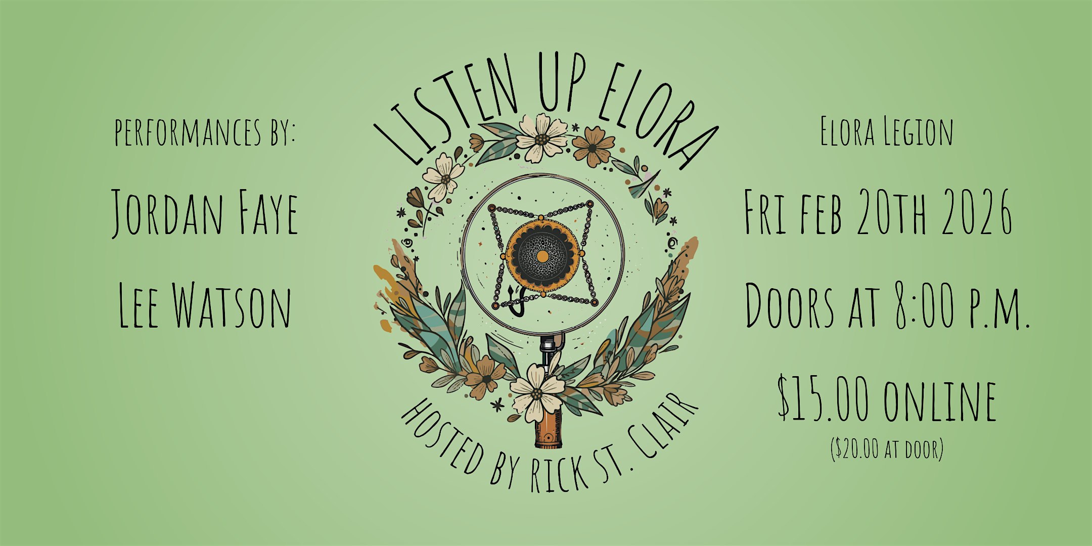 by admin13Feb Listen Up Elora #2 – Jordan Faye and Lee Watson at Royal Canadian Legion Branch 229 – Elora, Canada Listen Up Elora #2 – Jordan Faye and Lee Watson at Royal Canadian Legion Branch 229 – Elora, Canada 2 2 people viewed this event. Listen Up Elora is an event for listening. Artists wear their hearts on their sleeves, and the audience willingly receives. Tickets-RSVP Link Date And Time Saturday, February 21st, 2026 01:00 AM (PST) Venue Royal Canadian Legion Branch 229 Location 110 Metcalfe Street, Elora, Canada N0B 1S0 Event Types Concert or PerformanceMusic Event Category Canada Share With Friends Facebook Twitter Linkedin Xing Pinterest Share This Post: