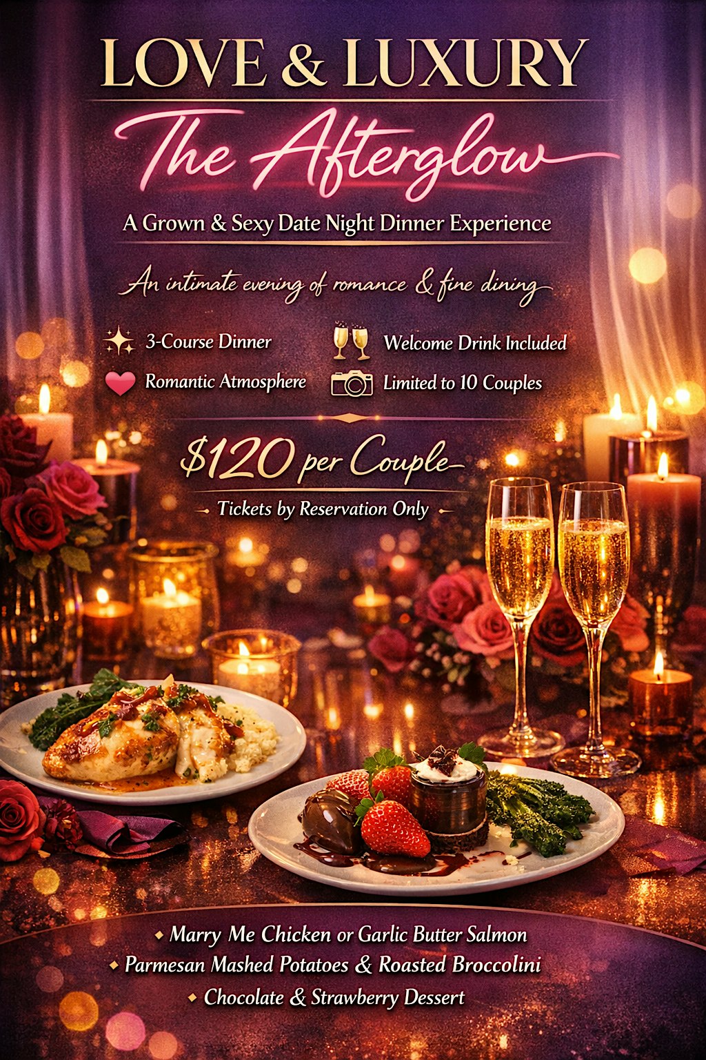 by admin12Feb Love & Luxury: The Afterglow – A Grown & Sexy Date Night Dinner Experience at Carter Designz – High Point, NC Love & Luxury: The Afterglow – A Grown & Sexy Date Night Dinner Experience at Carter Designz – High Point, NC 9 9 people viewed this event. Skip the crowds and enjoy an intimate, candlelit 3-course date night experience with great food, a welcome drink, and beautiful vibes. Tickets-RSVP Link Date And Time Saturday, February 21st, 2026 11:00 PM (PST) Venue Carter Designz Location 2921 East Martin Luther King Junior Drive, High Point, NC 27260 Event Types Food & Drink Event Category GreensboroNorth Carolina Share With Friends Facebook Twitter Linkedin Xing Pinterest Share This Post:
