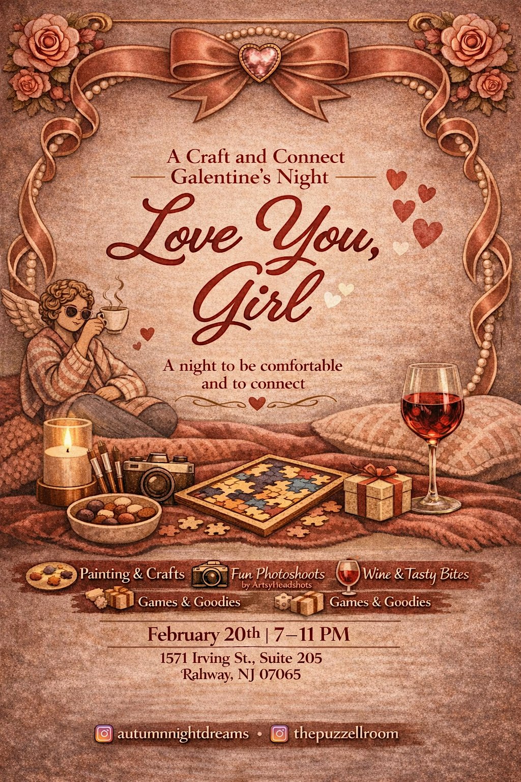 by admin12Feb Love You, Girl at 1571 Irving St. – Rahway, NJ Love You, Girl at 1571 Irving St. – Rahway, NJ 5 5 people viewed this event. A low-pressure creative night centered on connection, play, and making things together. Good time with good company. Tickets-RSVP Link Date And Time Saturday, February 21st, 2026 12:00 AM (PST) Venue 1571 Irving St. Location Suit 205, Rahway, NJ 7065 Event Types Community & CultureParty or Social Gathering Event Category New BrunswickNew Jersey Share With Friends Facebook Twitter Linkedin Xing Pinterest Share This Post: