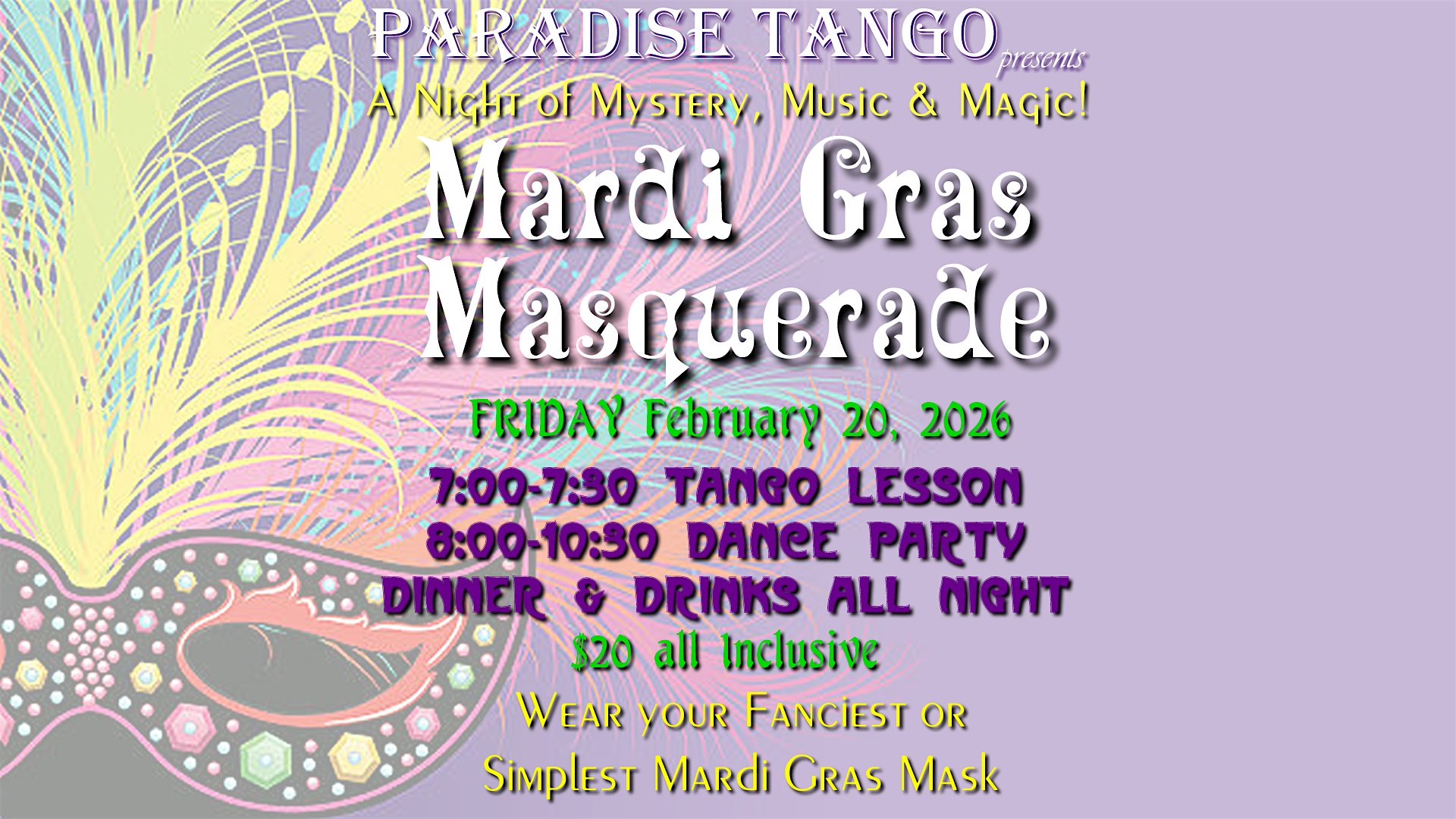 by admin12Feb Mardi Gras Masquerade: A Night of Mystery, Music & Magic! at Paradise Tango – Honolulu, HI Mardi Gras Masquerade: A Night of Mystery, Music & Magic! at Paradise Tango – Honolulu, HI 6 6 people viewed this event. Unmask the Magic with New Orleans Flair, Tango Elegance, and Mardi Gras Indulgence! Tickets-RSVP Link Date And Time Saturday, February 21st, 2026 05:00 AM (PST) Venue Paradise Tango Location 2600 S. King Street, Honolulu, HI 96826 Event Types Party or Social GatheringPerforming & Visual Arts Event Category HawaiiHonolulu Share With Friends Facebook Twitter Linkedin Xing Pinterest Share This Post: