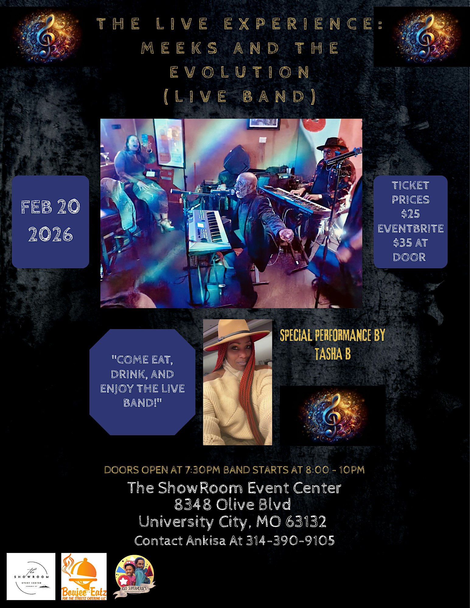 by admin12Feb Meeks and The Evolution With a special performance & hosting by Tasha B at The Showroom – St. Louis, MO Meeks and The Evolution With a special performance & hosting by Tasha B at The Showroom – St. Louis, MO 5 5 people viewed this event. Meeks and The Evolution BACK by popular demand live band performance in 2026, with a performance & hosting by Tasha B Live Band Debut Tickets-RSVP Link Date And Time Saturday, February 21st, 2026 02:00 AM (PST) Venue The Showroom Location 8348 Olive Boulevard, St. Louis, MO 63132 Event Types Concert or PerformanceMusic Event Category MissouriSt. Louis Share With Friends Facebook Twitter Linkedin Xing Pinterest Share This Post: