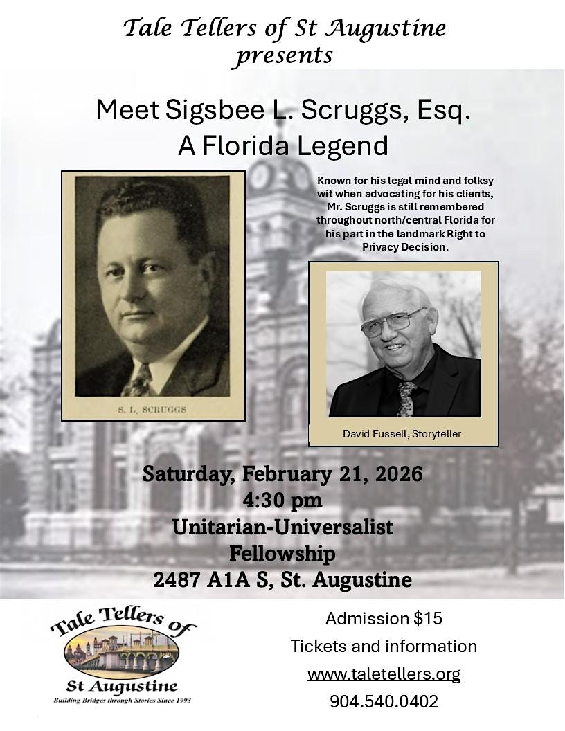 by admin13Feb Meet Sigsbee L. Scruggs, Esq. : A Florida Legend at Unitarian-Universalist Fellowship – St. Augustine, FL Meet Sigsbee L. Scruggs, Esq. : A Florida Legend at Unitarian-Universalist Fellowship – St. Augustine, FL 2 2 people viewed this event. Meet Sigsbee L. Scruggs, Esq. who was special counsel for Marjorie Kinnan Rawlings during her invasion of privacy trial. Tickets-RSVP Link Date And Time Saturday, February 21st, 2026 09:00 PM (PST) Venue Unitarian-Universalist Fellowship Location 2487 A1A South, St. Augustine, FL 32080 Event Types Community & CultureConcert or Performance Event Category Florida Share With Friends Facebook Twitter Linkedin Xing Pinterest Share This Post: