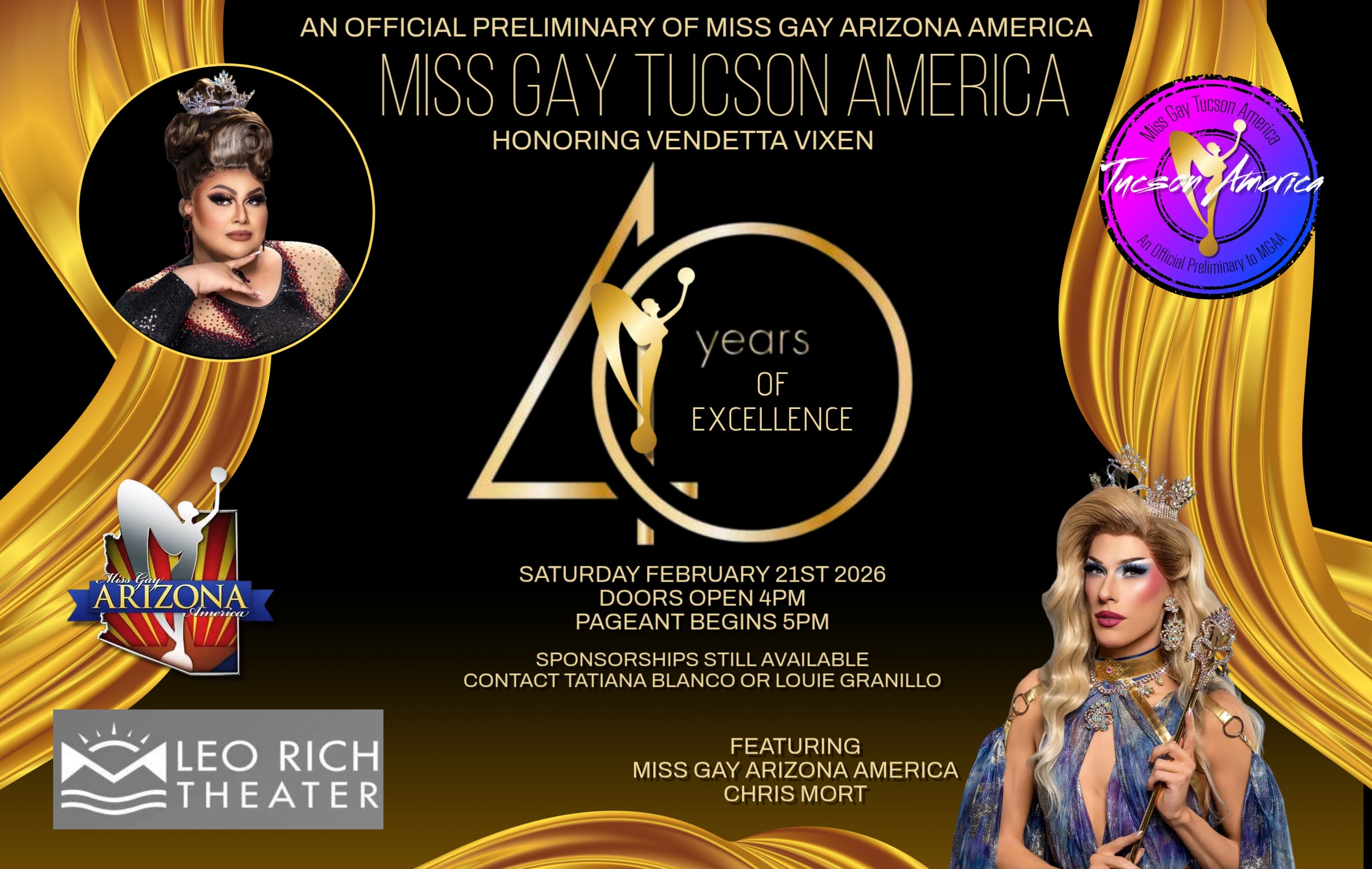 Miss Gay Tucson America was first crowned in September of 1986. That year Aviva Diamond won the title that would become Tucson’s longest running female impersonator pageant. This year, we are celebrating 40 years of legacy. Miss Gay Tucson America is an official preliminary to Miss Gay Arizona America. Honoring Miss Gay Tucson America 2025 Vendetta Vixen. Featuring our Symbol of Excellence Miss Gay Arizona America Chris Mort.