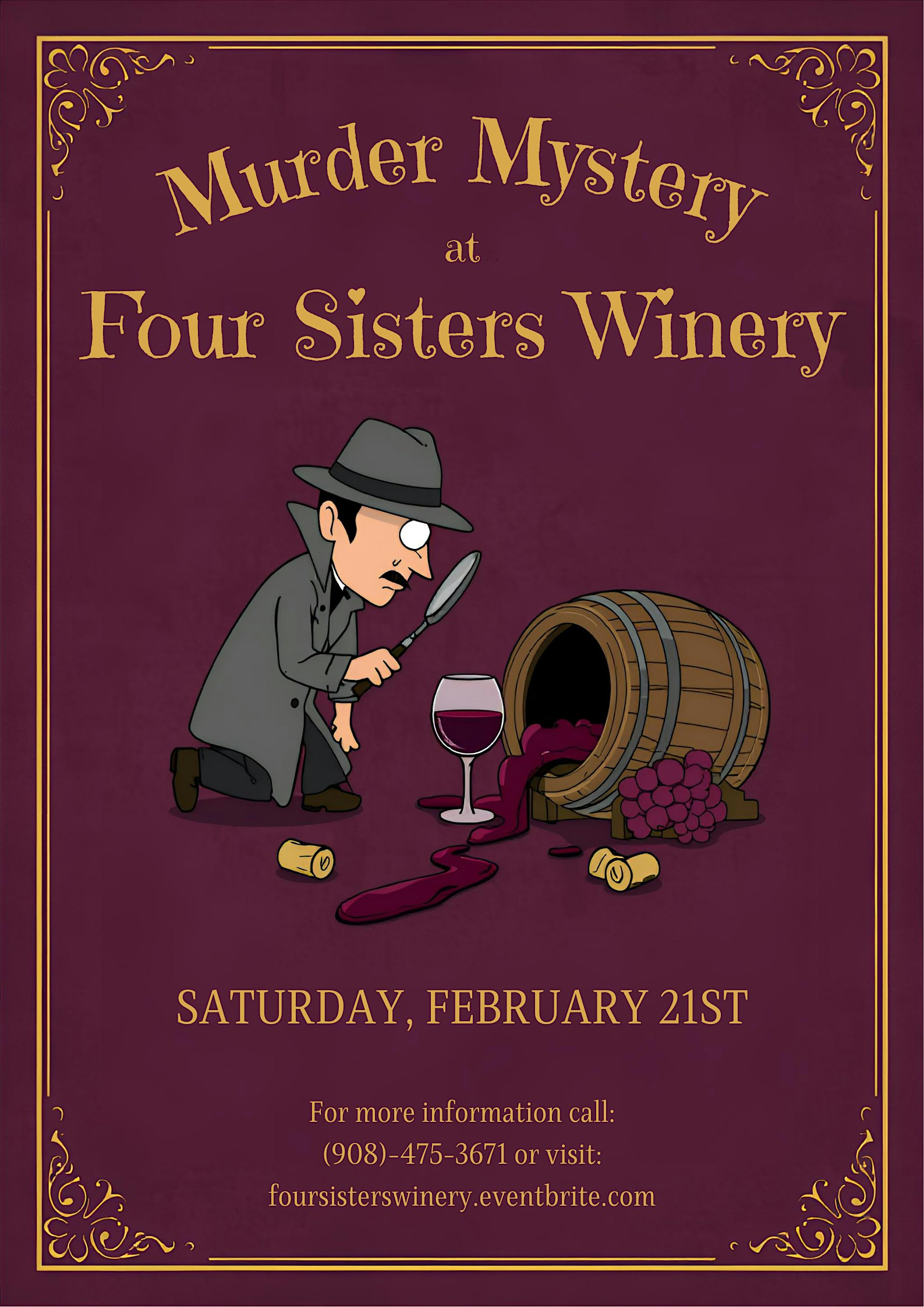 by admin12Feb Murder Mystery at Four Sisters Winery – Belvidere, NJ Murder Mystery at Four Sisters Winery – Belvidere, NJ 4 4 people viewed this event. Dive into the mystery and catch the culprit in our live Murder Mystery event—fun and suspense guaranteed! Tickets-RSVP Link Date And Time Saturday, February 21st, 2026 06:00 PM (PST) Venue Four Sisters Winery Location 783 County Road 519, Belvidere, NJ 7823 Event Types Food & DrinkParty or Social Gathering Event Category New Jersey Share With Friends Facebook Twitter Linkedin Xing Pinterest Share This Post:
