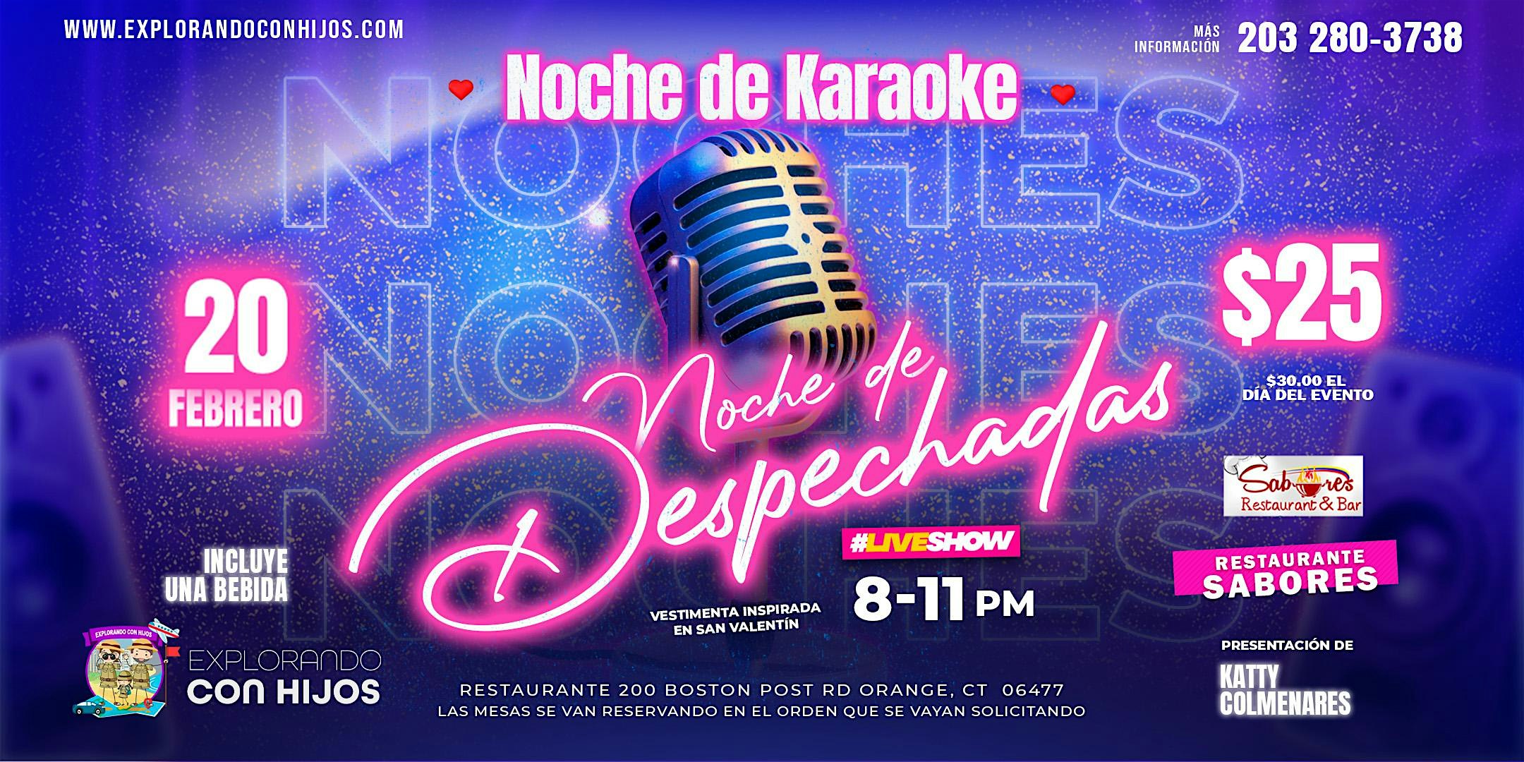 by admin12Feb Noche de Despechadas at 200 Boston Post Rd – Orange, CT Noche de Despechadas at 200 Boston Post Rd – Orange, CT 4 4 people viewed this event. Noche de Despechadas: karaoke, risas y amigas. Ven a cantar, soltar y olvidar los problemas en una noche solo para mujeres ✨ Tickets-RSVP Link Date And Time Saturday, February 21st, 2026 01:00 AM (PST) Venue 200 Boston Post Rd Location 200 Boston Post Road, Orange, CT 6477 Event Category Connecticut Share With Friends Facebook Twitter Linkedin Xing Pinterest Share This Post: